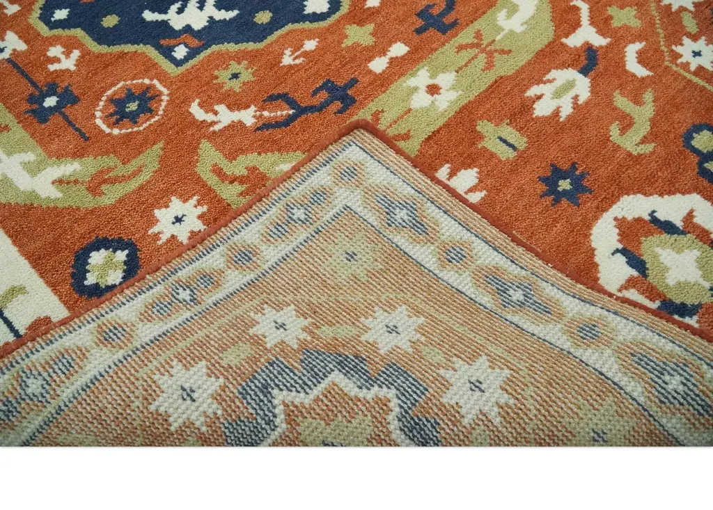 This hand-knotted wool rug features a traditional medallion Mamluk design in rust and blue hues. Its versatile multi-size options offer an elegant touch to any space. Crafted with quality and durability, this rug brings warmth and style to your home. Hand-Knotted Made with Wool Sizes are made to order in 30-45 days Color: Rust and Blue USERS GUIDE Avoid prolonged moisture Vacuum regularly and/or shake to remove dust Do not pull any loose threads. Use scissors to simply cut the ends The blot spills immediately with a white cloth. Harsh chemicals may damage or fade the rug Use rug protectors under heavy furniture