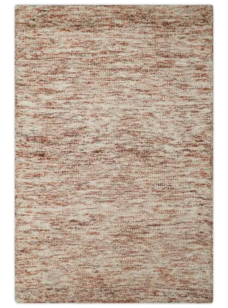 The modern subtle design and beautiful tone-on-tone colors fit in any space. Hand-made with wool. It's perfect for a modern space but not limited to it. The loop and cut pile give the rug a unique texture. SIZES MADE TO ORDER IN 15-20 DAYS Hand Woven The rug size in the image is 2x3 Made with Wool Color : Rust and Ivory USERS GUIDE Avoid prolonged moisture Vacuum regularly and/or shake to remove dust Do not pull any loose threads. Use scissors to simply cut the ends Blot spills immediately with a white cloth. Harsh chemicals may damage or fade the rug Use rug protectors under heavy furniture