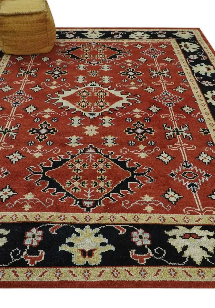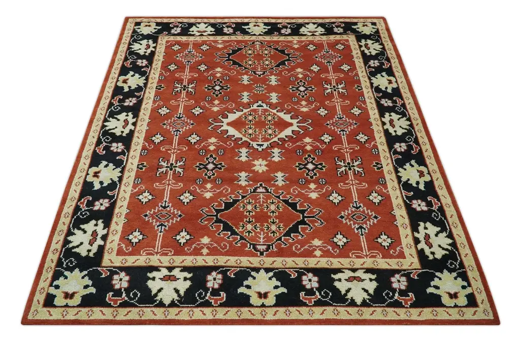 This traditional area rug features a timeless design in shades of brown, black, and beige. Hand-knotted from high-quality wool, it offers durability and versatility in multiple sizes. Bring elegant warmth to any room with this Oriental-inspired piece. Hand-Knotted Made with Wool Made to Order in 30-45 Days Color: Rust, Black, and Beige This specific rug is made in India, in the city of Bhadohi. Bhadohi is one of the biggest rug manufacturing cities. Carpet weaving in the region dates back to the 16th century during the reign of Akbar. The skilled artisans of Bhadohi have been carrying the tradition of rug-making for centuries. USERS GUIDE Avoid prolonged moisture Vacuum regularly and/or shake to remove dust Do not pull any loose threads. Use scissors to simply cut the ends Blot spills immediately with a white cloth. Harsh chemicals may damage or fade the rug Use rug protectors under heavy furniture