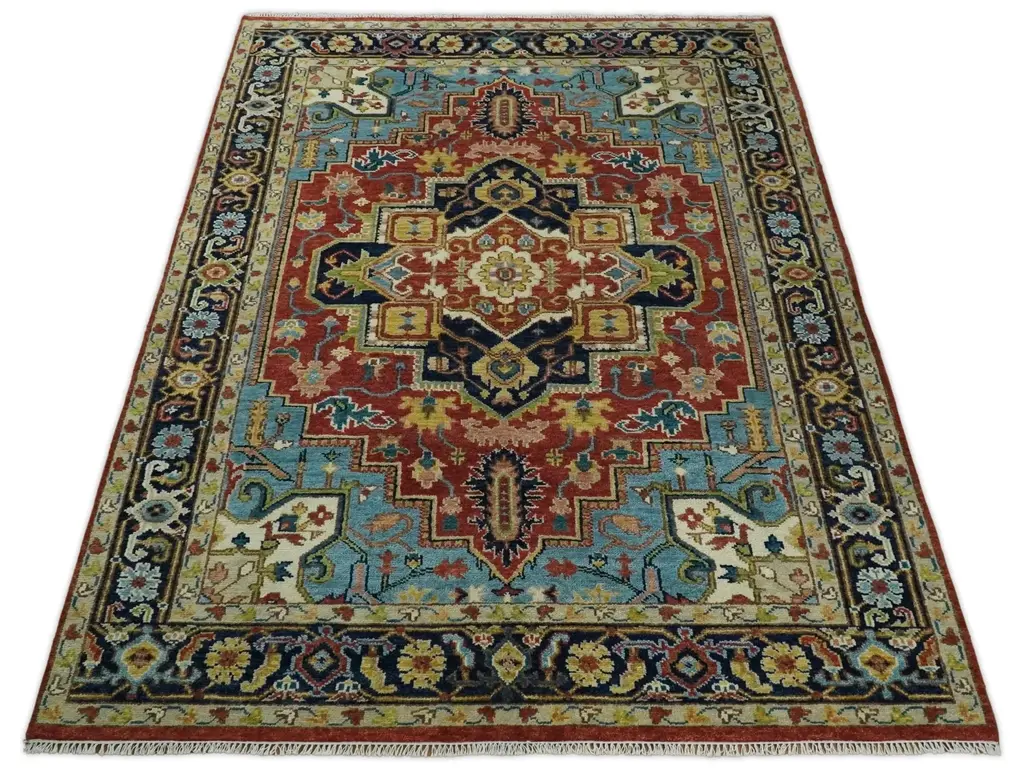 This Hand-Knotted Rug has been Made with Handspun Wool. The beautiful colors of the rug carry a legacy of the famous Heriz rug, the traditional design of the rug completes your space without making it look busy. Heriz rugs are durable and can last for decades if treated right. Hand-Knotted Sizes are Made to order in 30-60 days Made with Soft Wool Color: Rust and Blue Made with 25 knots per square inch Hand Knotted rugs have been made for centuries and carry a tradition and art. This specific rug is made in India, in the city of Bhadohi. Bhadohi is one of the biggest rug manufacturing cities. Carpet weaving in the region dates back to the 16th century during the reign of Akbar. The skilled artisans of Bhadohi have been carrying the tradition of rug-making for centuries. USERS GUIDE Avoid prolonged moisture Vacuum regularly and/or shake to remove dust Do not pull any loose threads. Use scissors to simply cut the ends Blot spills immediately with a white cloth. Harsh chemicals may damage or fade the rug Use rug protectors under heavy furniture