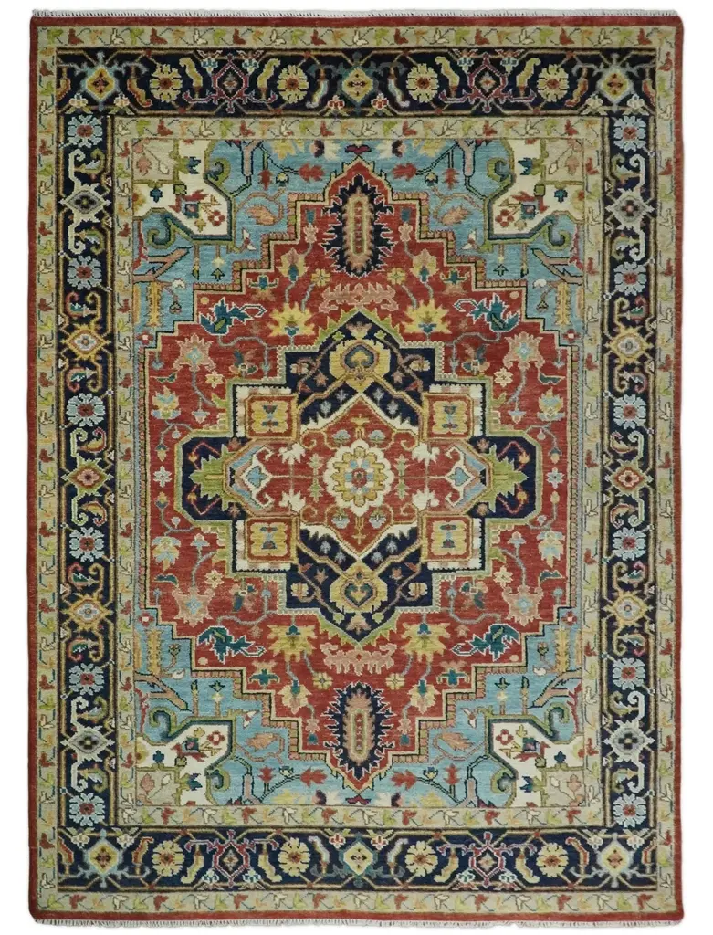 This Hand-Knotted Rug has been Made with Handspun Wool. The beautiful colors of the rug carry a legacy of the famous Heriz rug, the traditional design of the rug completes your space without making it look busy. Heriz rugs are durable and can last for decades if treated right. Hand-Knotted Sizes are Made to order in 30-60 days Made with Soft Wool Color: Rust and Blue Made with 25 knots per square inch Hand Knotted rugs have been made for centuries and carry a tradition and art. This specific rug is made in India, in the city of Bhadohi. Bhadohi is one of the biggest rug manufacturing cities. Carpet weaving in the region dates back to the 16th century during the reign of Akbar. The skilled artisans of Bhadohi have been carrying the tradition of rug-making for centuries. USERS GUIDE Avoid prolonged moisture Vacuum regularly and/or shake to remove dust Do not pull any loose threads. Use scissors to simply cut the ends Blot spills immediately with a white cloth. Harsh chemicals may damage or fade the rug Use rug protectors under heavy furniture