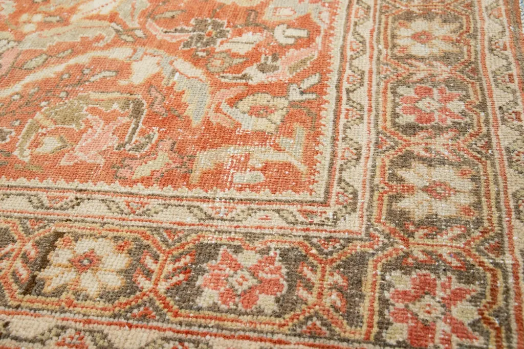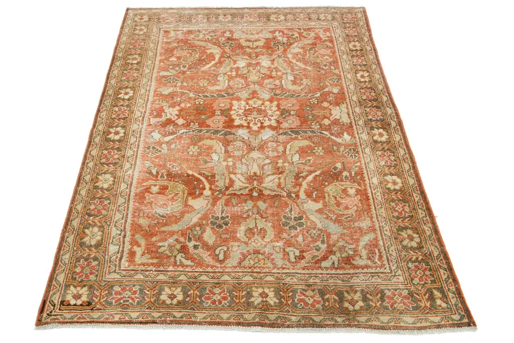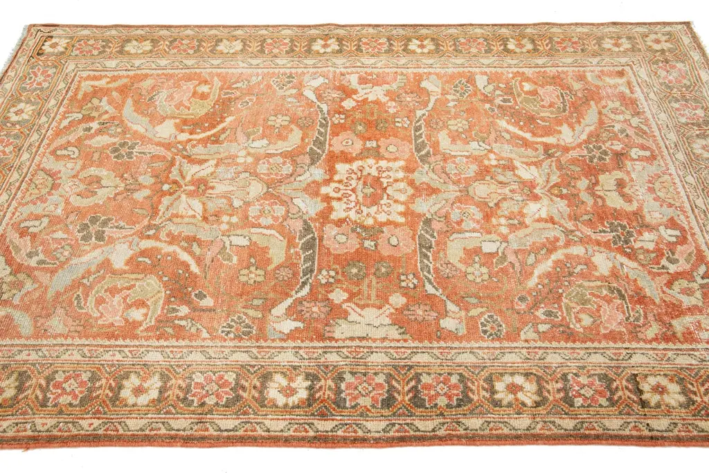 Beautiful Vintage Mahal hand-knotted wool rug with a rust color field. This Persian rug has beige, gray, pink, and brown hues throughout the floral motif.This rug measures 5'1" x 7'6".