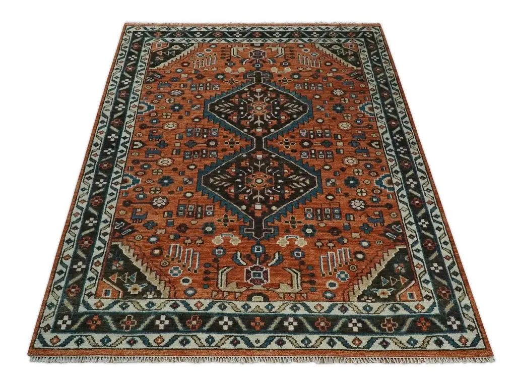 This Hand-Knotted Rust & Brown Colored Oriental Rug has been Made with Handspun Wool. The beautiful colors of the rug carry a legacy of the heirloom rug. The traditional design of the rug completes your space without making it look busy. Hand-Knotted rugs are durable and can last for decades if treated right. Hand-Knotted Sizes are made to order 30-45 days Made with Wool Color: Rust, Ivory, and Brown Made with 25 knots per square inch This specific rug is made in India, in the city of Bhadohi. Bhadohi is one of the biggest rug manufacturing cities. Carpet weaving in the region dates back to the 16th century during the reign of Akbar. The skilled artisans of Bhadohi have been carrying the tradition of rug-making for centuries. USERS GUIDE Avoid prolonged moisture Vacuum regularly and/or shake to remove dust Do not pull any loose threads. Use scissors to simply cut the ends Blot spills immediately with a white cloth. Harsh chemicals may damage or fade the rug Use rug protectors under heavy furniture