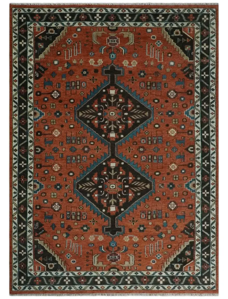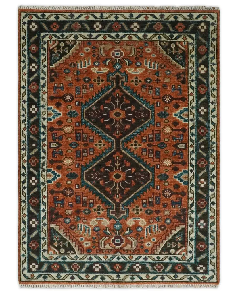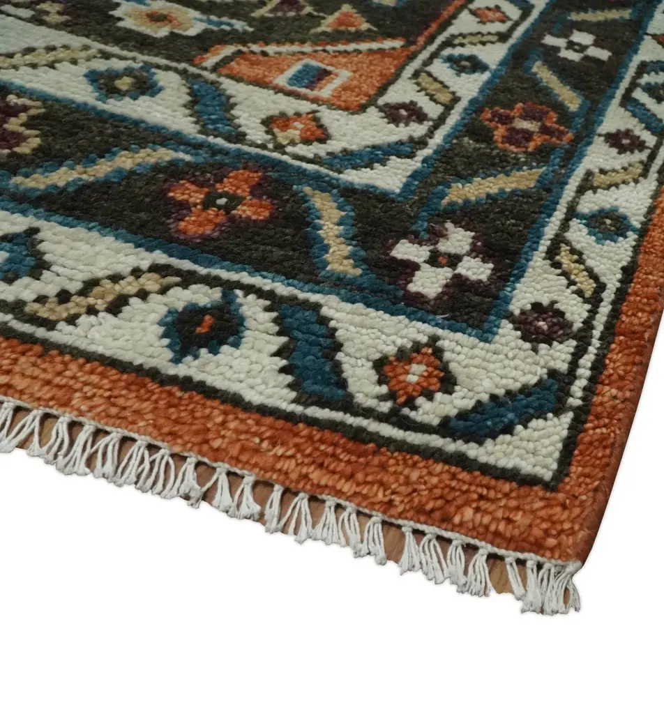 This Hand-Knotted Rust & Brown Colored Oriental Rug has been Made with Handspun Wool. The beautiful colors of the rug carry a legacy of the heirloom rug. The traditional design of the rug completes your space without making it look busy. Hand-Knotted rugs are durable and can last for decades if treated right. Hand-Knotted Sizes are made to order 30-45 days Made with Wool Color: Rust, Ivory, and Brown Made with 25 knots per square inch This specific rug is made in India, in the city of Bhadohi. Bhadohi is one of the biggest rug manufacturing cities. Carpet weaving in the region dates back to the 16th century during the reign of Akbar. The skilled artisans of Bhadohi have been carrying the tradition of rug-making for centuries. USERS GUIDE Avoid prolonged moisture Vacuum regularly and/or shake to remove dust Do not pull any loose threads. Use scissors to simply cut the ends Blot spills immediately with a white cloth. Harsh chemicals may damage or fade the rug Use rug protectors under heavy furniture