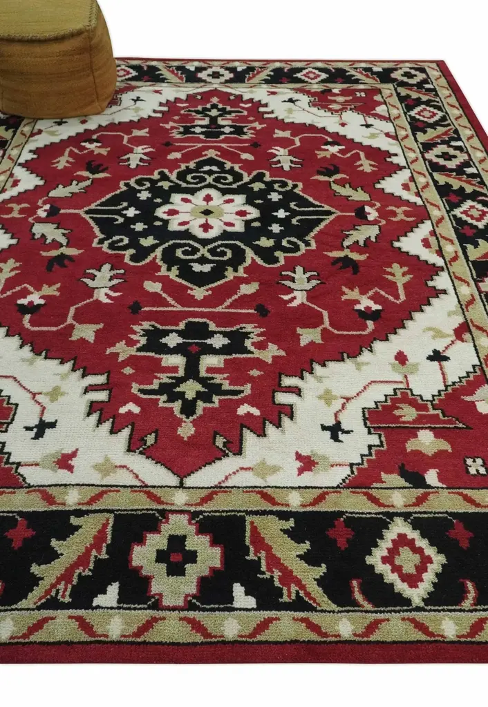 This Hand Knotted Traditional Heriz Rug showcases a color palette of rust, ivory, black and beige. Made of premium quality wool, its timeless design offers durability and adds warmth to any room. Bring a touch of traditional elegance to your home with this versatile, multi-sized rug. Hand-Knotted Made with Wool Sizes are made to order in 30-45 days Color: Rust, Ivory, Black and Beige USERS GUIDE Avoid prolonged moisture Vacuum regularly and/or shake to remove dust Do not pull any loose threads. Use scissors to simply cut the ends The blot spills immediately with a white cloth. Harsh chemicals may damage or fade the rug Use rug protectors under heavy furniture