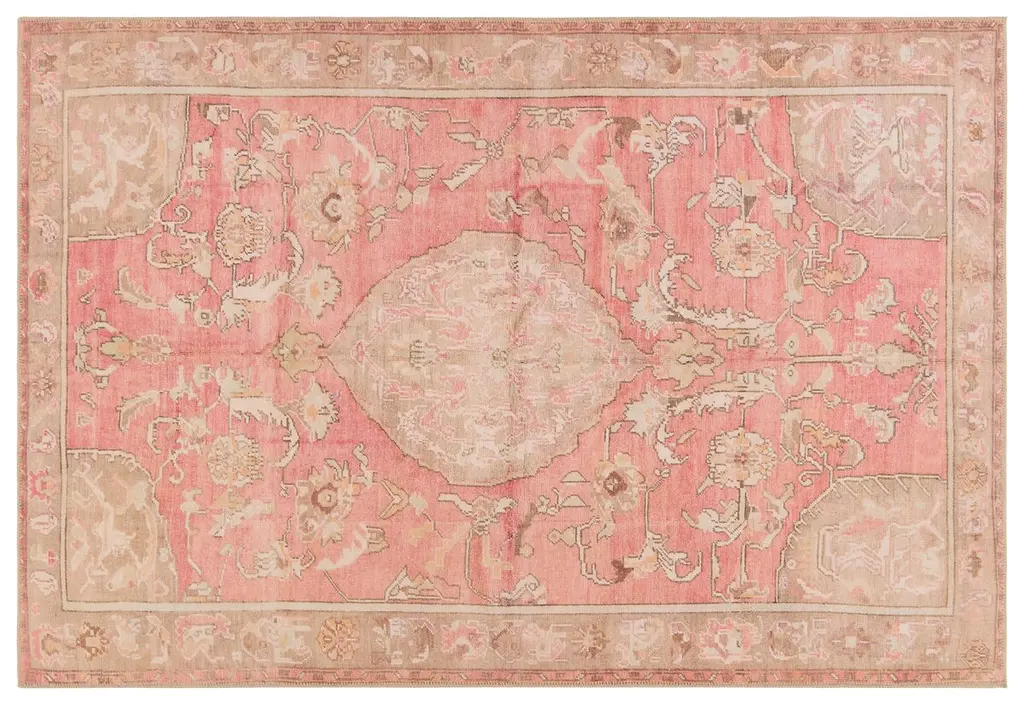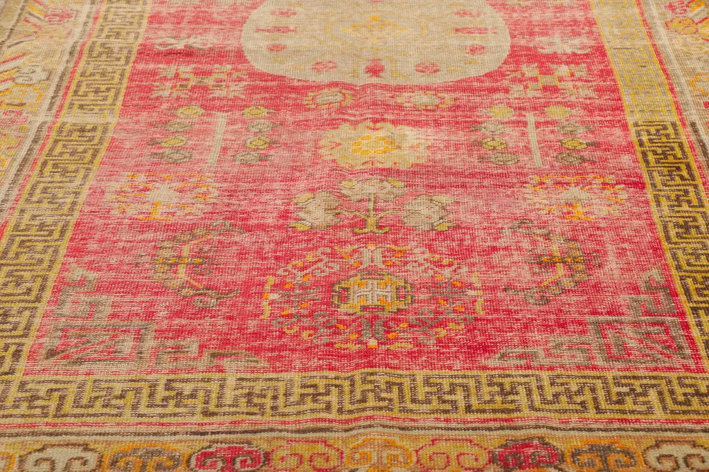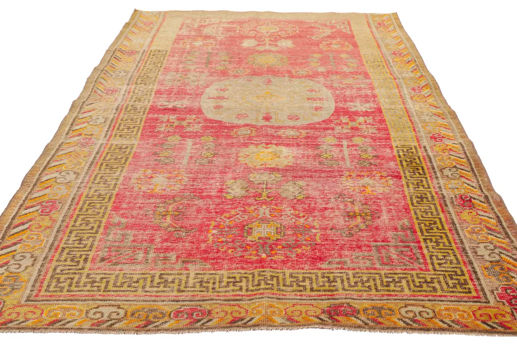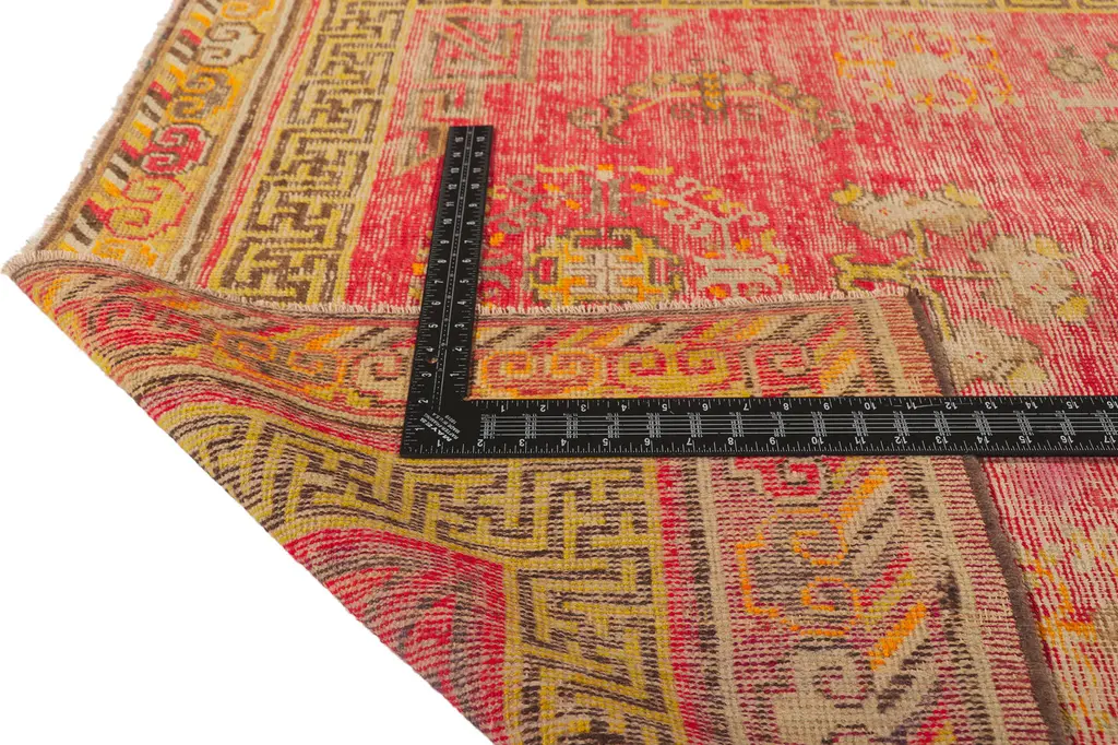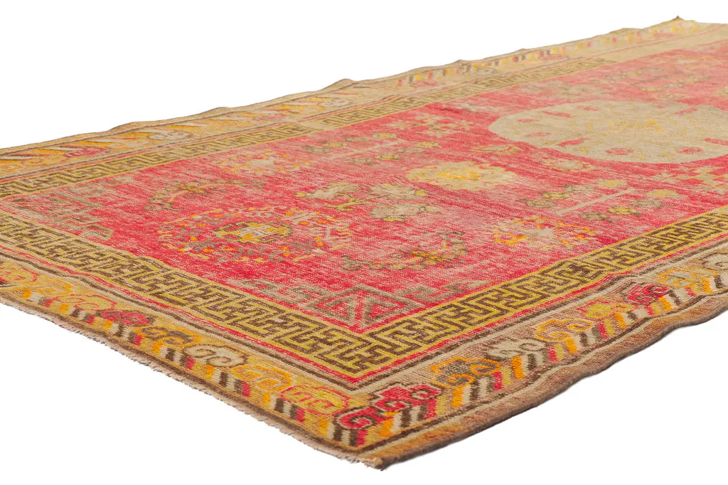 This hand knotted wool distressed vintage Turkish rug features a prominent round medallion patterned with pomegranates like most carpets from Khotan and East Turkestan. The weathered red field hosts a variety of ambiguous tribal symbols heavily influenced from Chinese, Tibetan, Persian, Turkish and Turkmen designs. Iconic fretwork patterns emanate from the corner spandrels. The main border depicts Ruyi clouds and stripes with a fretwork guard border.