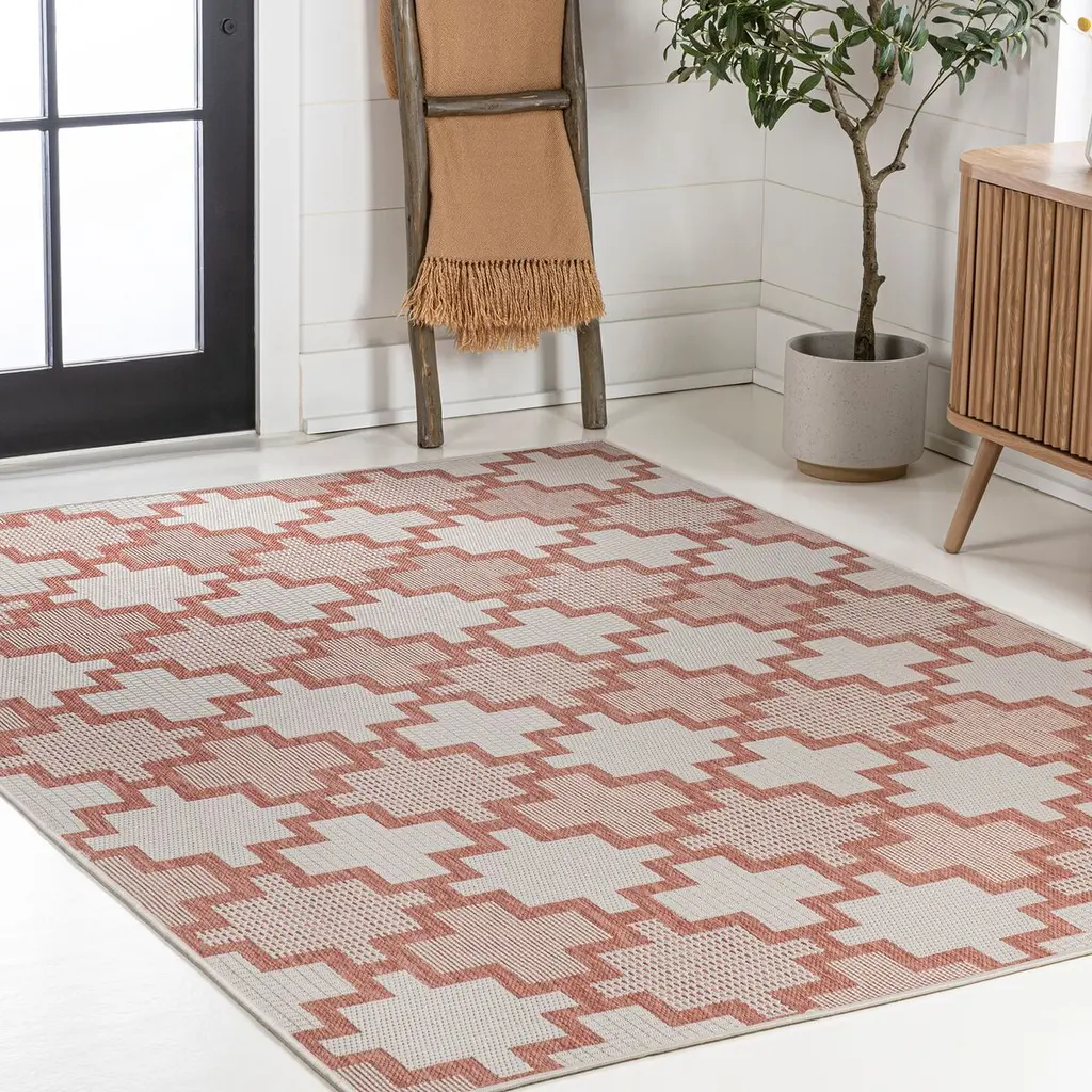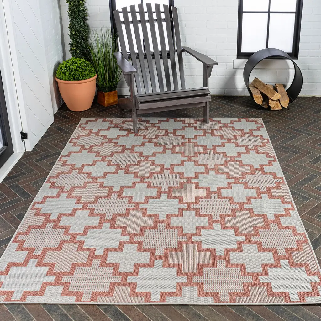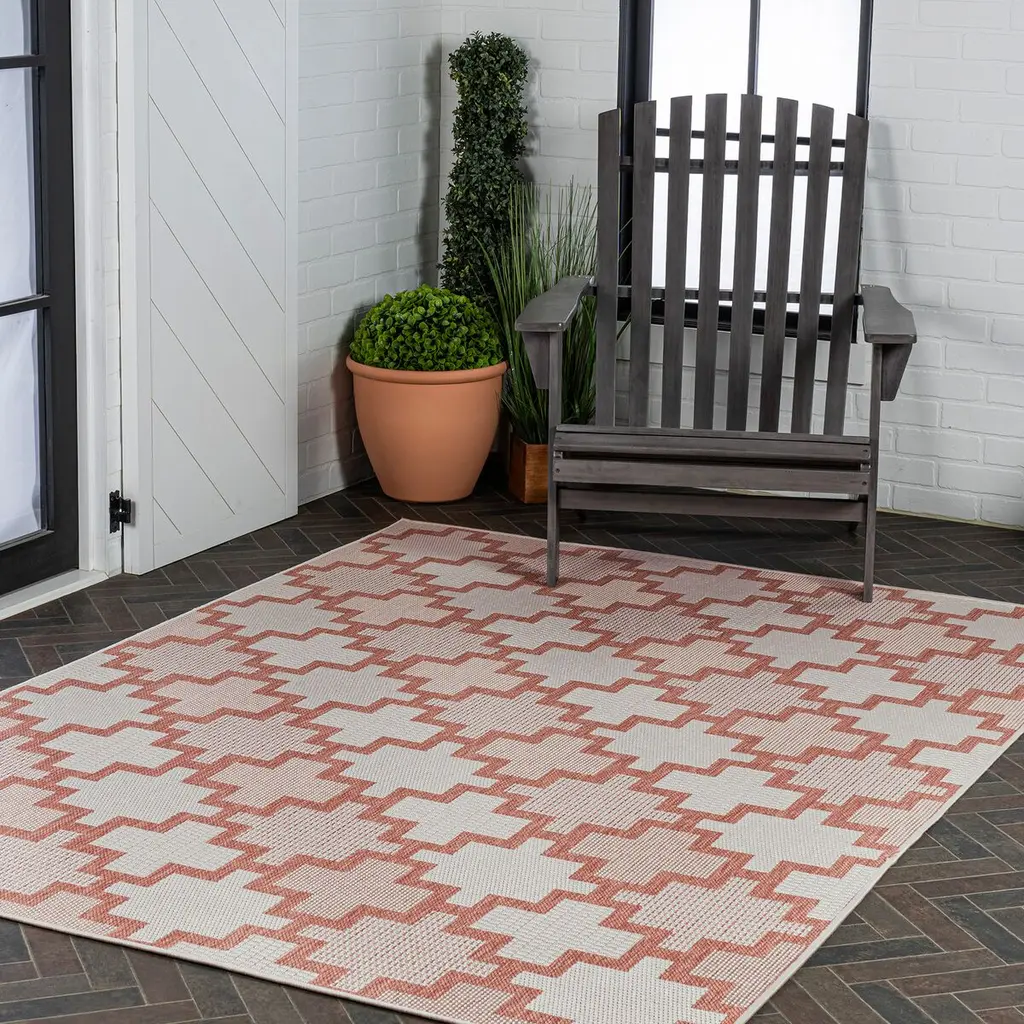 Our modern geometric rug is inspired by Mediterranean and Southwestern designs. It's made from durable synthetic fibers woven into a classic tile pattern. Use this easy-care rug outdoors on a porch, or in the bedroom, living room or dining room.