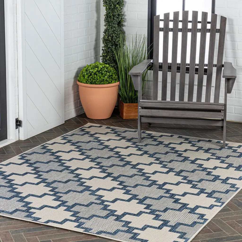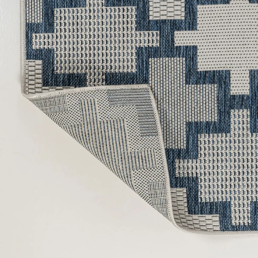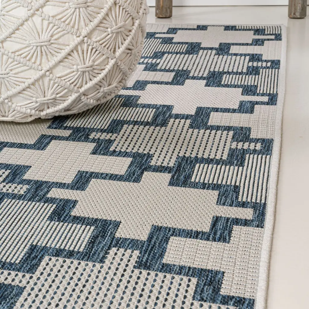 Our modern geometric rug is inspired by Mediterranean and Southwestern designs. It's made from durable synthetic fibers woven into a classic tile pattern. Use this easy-care rug outdoors on a porch, or in the bedroom, living room or dining room.