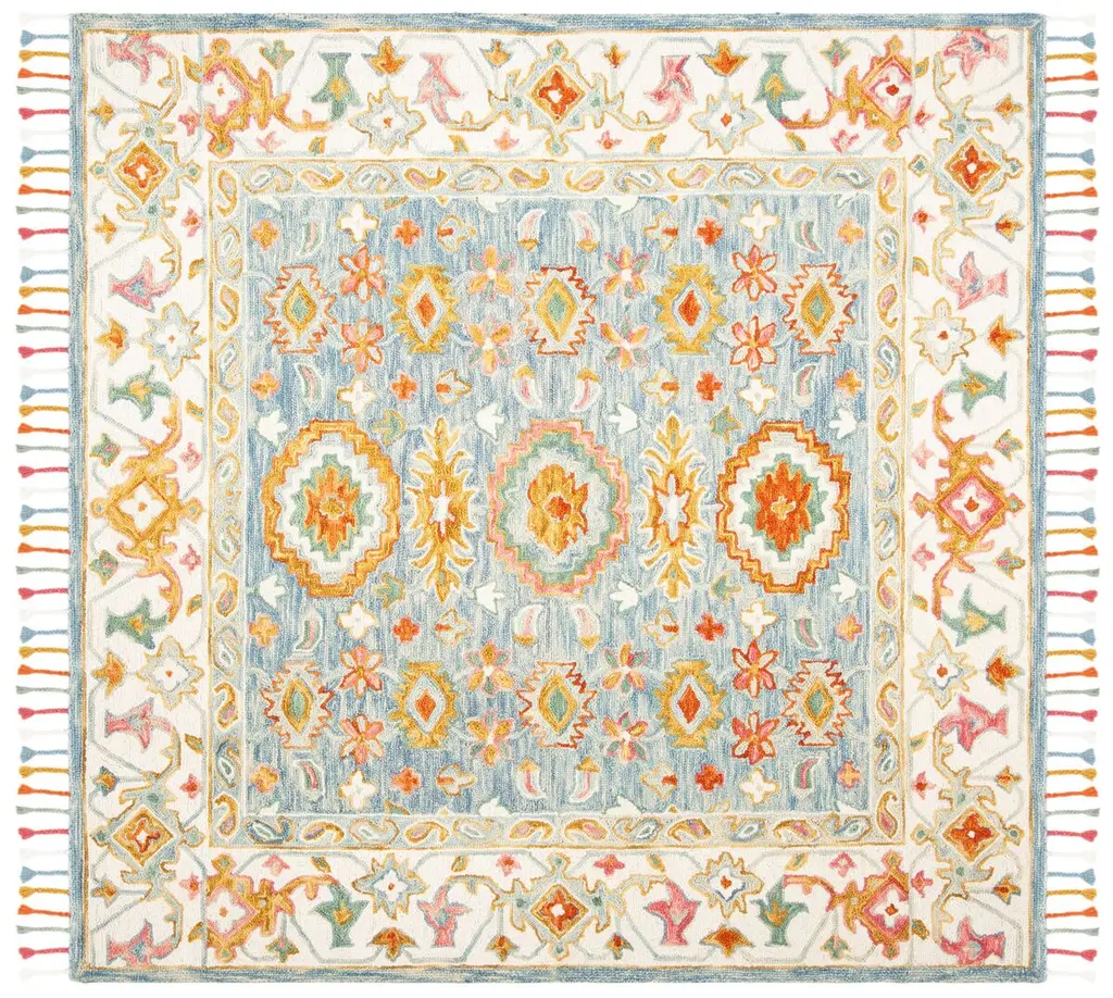 Elevate your living space with this exquisite 10' x 14' large rectangle area rug, featuring a harmonious blend of blue and ivory hues. Hand-tufted in India, its intricate design boasts timeless elegance, while the plush wool construction ensures lasting comfort and style underfoot. The rug showcases a classic pattern with delicate floral and geometric motifs, framed by a charming border that adds a touch of sophistication to any room. With a comfortable 3/8" pile height, it's not only a visual treat but a tactile one as well. Perfect for anchoring furniture in a grand living room or creating a cozy nook in a spacious bedroom, this piece will be the centerpiece of your decor.