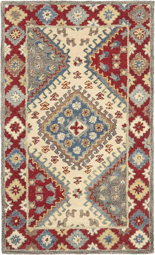Collection: Safeh Colors: Red, Ivory Construction: Hand Tufted Material: 80% Wool / 20% Cotton Pile: Medium Pile Pile Height: 0.4" Styles: Traditional Backing: Cotton Made In: India Thickness: 0.7" Price Range: $$$$$ (Affordable)