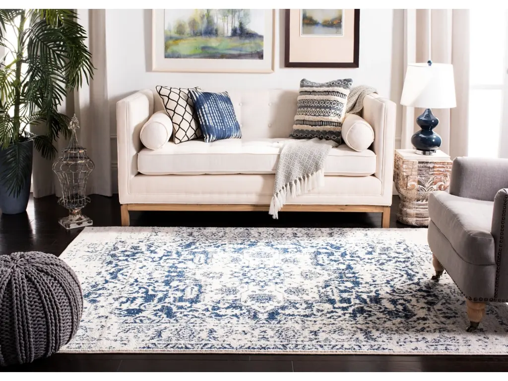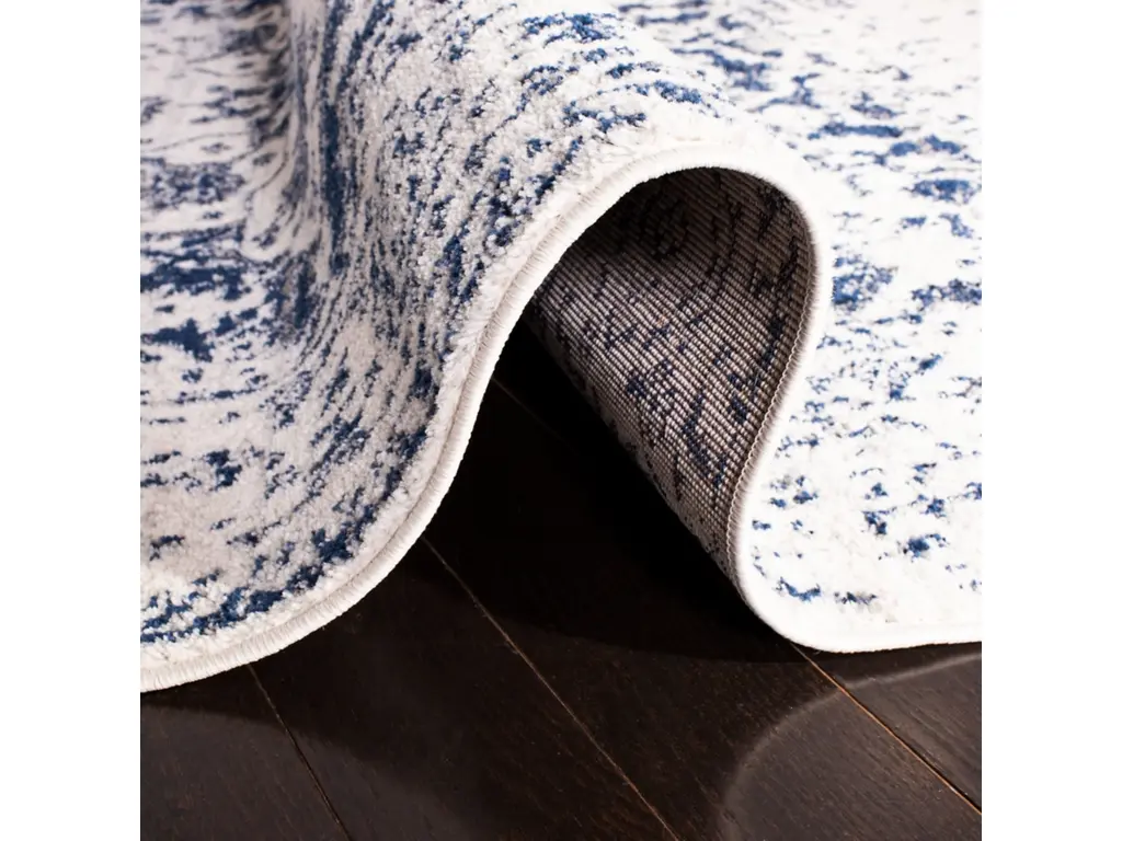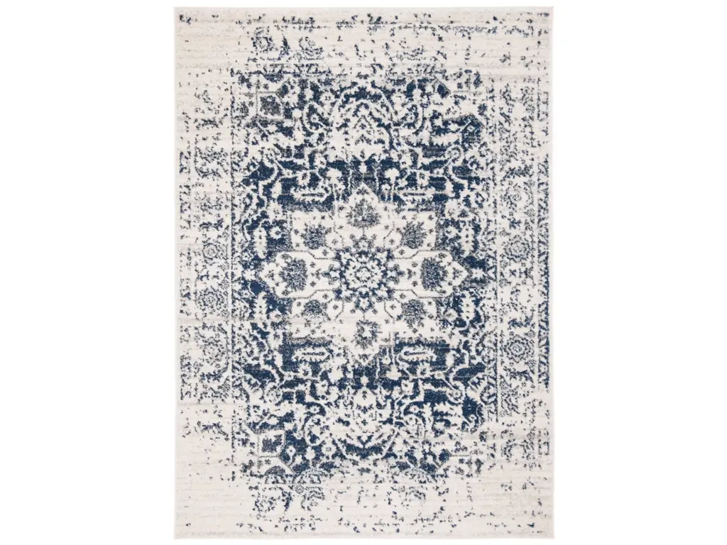 The heirloom elegance of yesteryear becomes chic, metro-mod décor in this contemporary styled, designer-look finish area rug. Traditional medallions and floral blooms, colored in décor-friendly navy and soft cream, are finished with a distressed, antique patina for a classic look that is all-together now. Power loomed using soft, easy-care synthetic yarns for long-lasting brilliance.