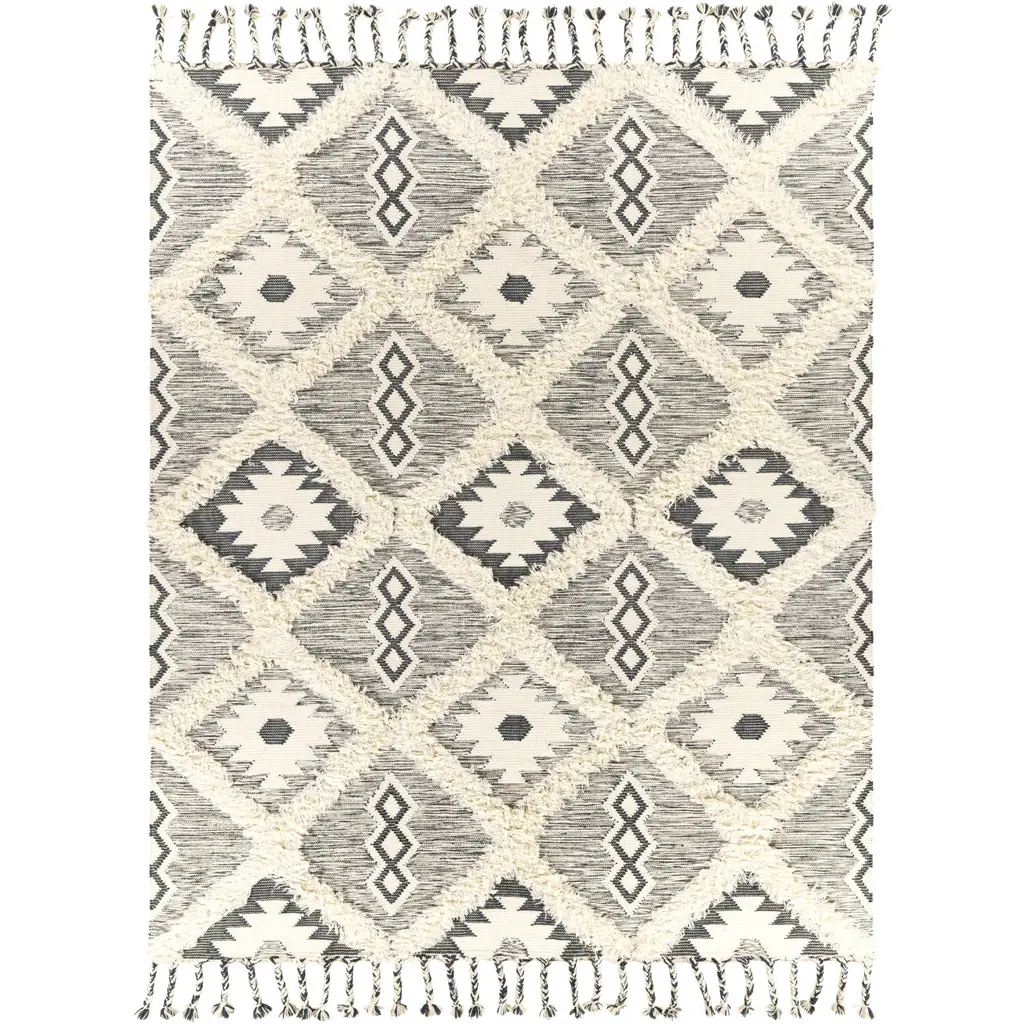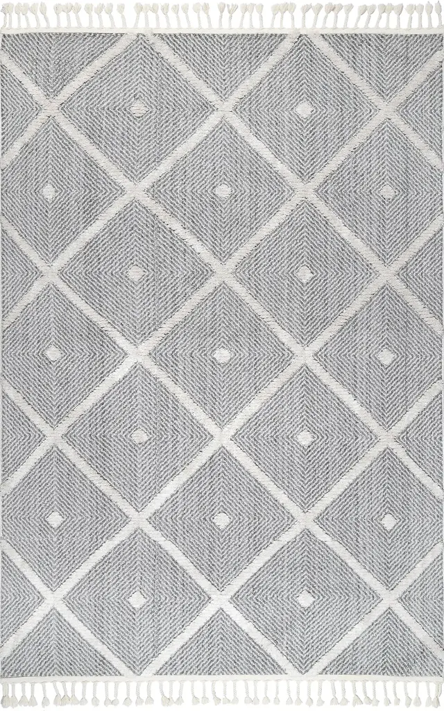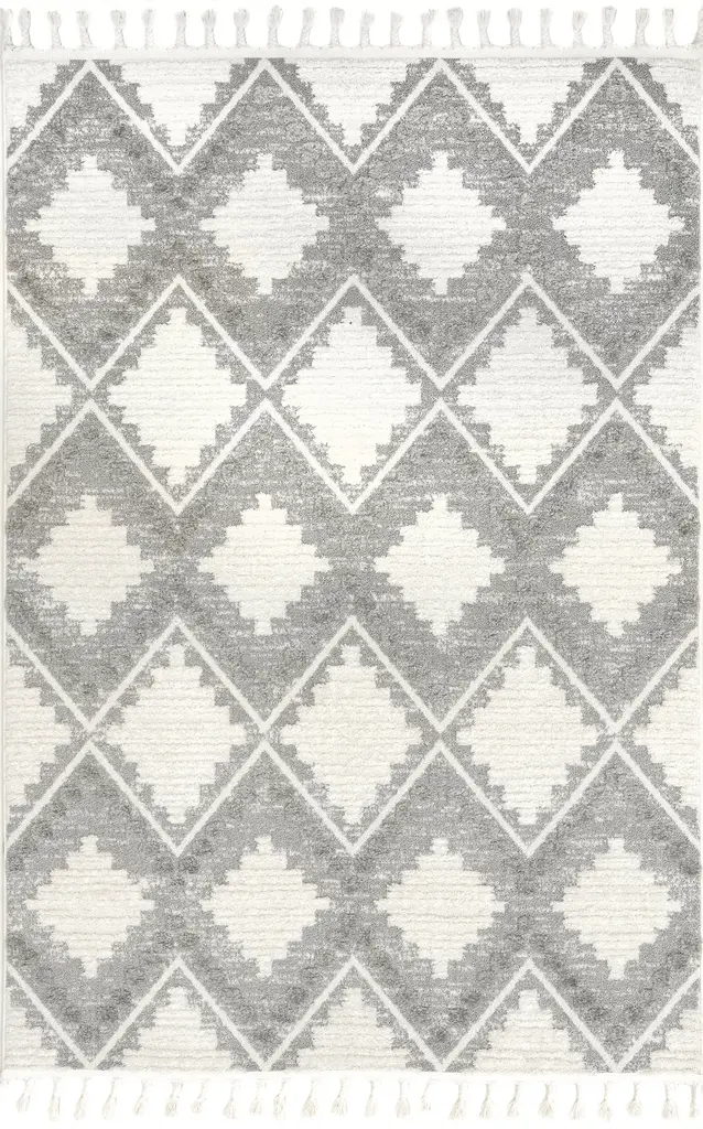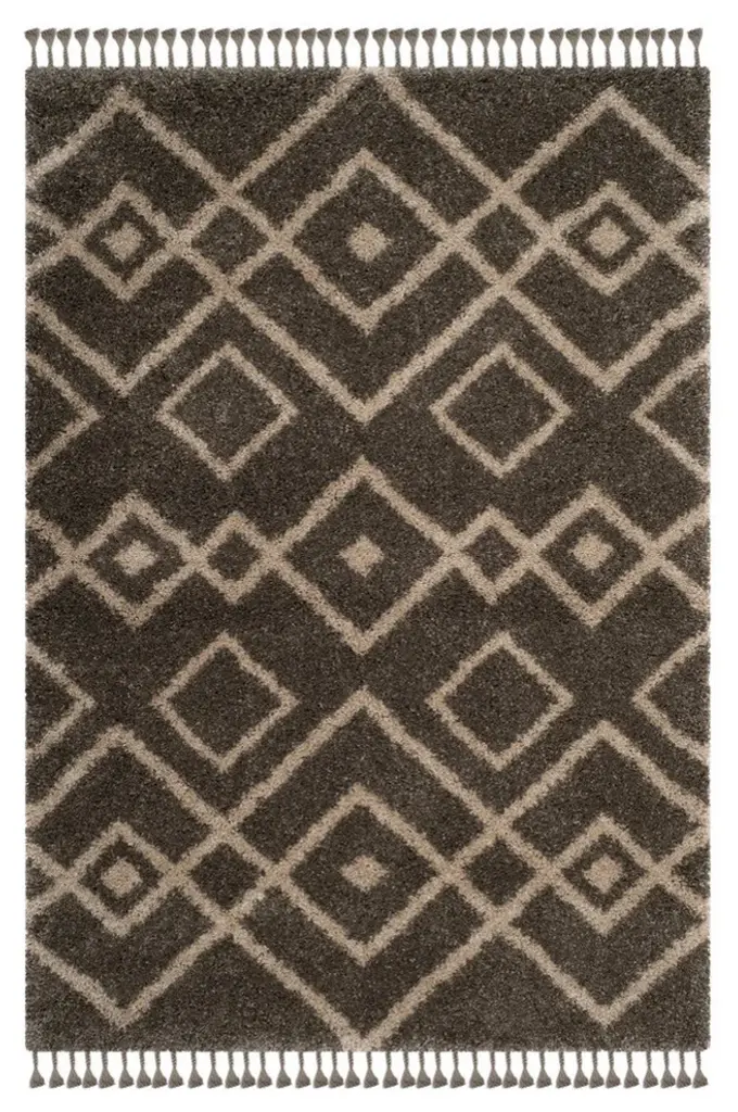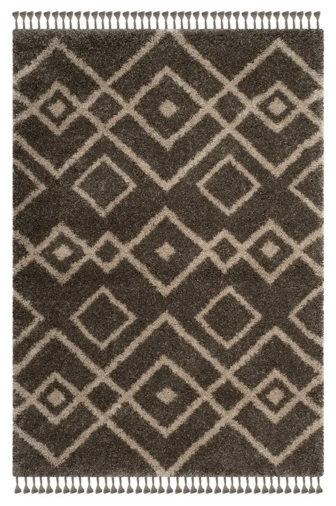 Moroccan Fringe Shag Rugs shift the focus from retro to trend-setting boho-chic. Styled for mod, rustic or classy-casual decor, these plush area rugs display engaging tribal motifs in warm, neutral colors and lush textures, and finished with fanciful fringes. Moroccan Fringe Shags are made with soft synthetic yarns for amazing comfort underfoot and long lasting beauty.Construction: Power LoomedMaterials: 100% PolypropyleneGeneral Care: Use rug protectors under the legs of heavy furniture to avoid flattening of your rug pile. Rotating your rug every few months will help relieve areas from excessive wear. Packing and shipping may cause temporary creases in area rugs. To remove them back-roll/reverse roll your rug and allow time for the creases to relax. Direct sunlight will cause the colors in your area rug to fade over time. Long term exposure to humid weather can be harmful to area rugs. The cotton warp and weft foundation of an area rug can breakdown when exposed to excessive humidity. Avoid placing plants directly on top of area rugs and immediately blot dry any water spillage. Brushing is the best way to remove stubborn pet hairs that the vacuum misses. For short pile area rugs, use a carpet brush or carpet sweeper. For longer pile a carpet rake works well. Sweeping works best for outdoor rugs. The sturdy pile of an indoor-outdoor rug does not trap dirt as readily as other area rugs. For rugs that are relatively easy to handle, bring them outdoors and shake vigorously to remove excess debris. Hang over an outdoor railing and beat with the back of a broom or rug beater, varying in vigor based on the construction and condition of the rug. Area rugs placed in high traffic areas will wear faster than those in lesser tread-upon locations. Rotating a rug every few months will distribute any wear and fading evenly.Vacuuming: Routine vacuuming with a high quality vacuum cleaner is the most important thing you can do to maintain the beauty of your rug. Vacuum thoroughly and frequently with a canister vacuum (preferably one without beater bars). This prevents permanent damage by keeping soil particles from working their way deep into your rug. Rugs placed in high traffic areas of your home or office should be vacuumed more frequently. Never vacuum the fringes of your rug, especially a hand-knotted rug.Cleaning & Removing Stains: Quick action following a spill is essential in order to keep a permanent stain from setting into your rug. For liquid spills, use a clean, undyed cloth and press firmly around the spill to absorb as much as possible. Do not rub! This will cause the stain to set deeper into the rug, making it harder to remove and increasing the likelihood that it will reappear. For hard to remove stains, professional rug cleaning is recommended.