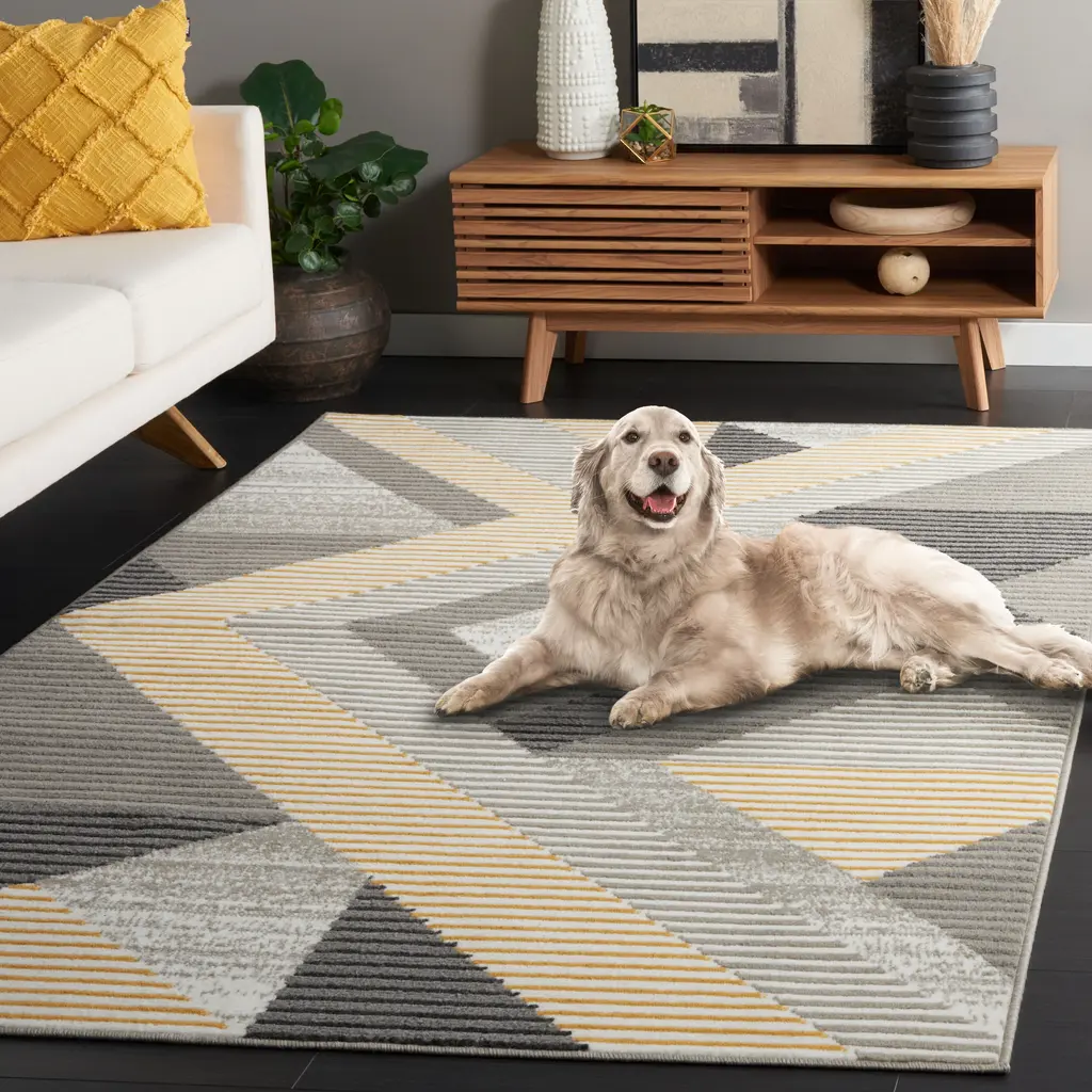 The Pyramid rug collection showcases distressed trendy styles in a muted color palette. These stunning rugs are a beautiful complement to modern and contemporary furnishings, and are supremely practical with virtually non-shedding fibers for placement in higher traffic areas.Features:Stain Resistant & Non-Shedding: Machine-woven from enhanced synthetic fibers for virtually no shedding and stain resistanceKid and Pet-Friendly: Safe for high-traffic areas of the home and conveniently kid approved and pet-friendly for life's unpredictable messesTrendy Style: Design beautifully enhances any room of the home, from the living room, dining room, bedroom, entryway, nursery, dorm room, study, home office, or eat-in kitchenEasy Maintenance & Durable: Stress-free cleaning includes regular vacuuming and gently blotting out minor stains with a mild detergent or carpet cleanerFeatured in SAFAVIEH's Pyramid CollectionFor over 100 years, SAFAVIEH has been crafting rugs of the highest quality and unmatched style.