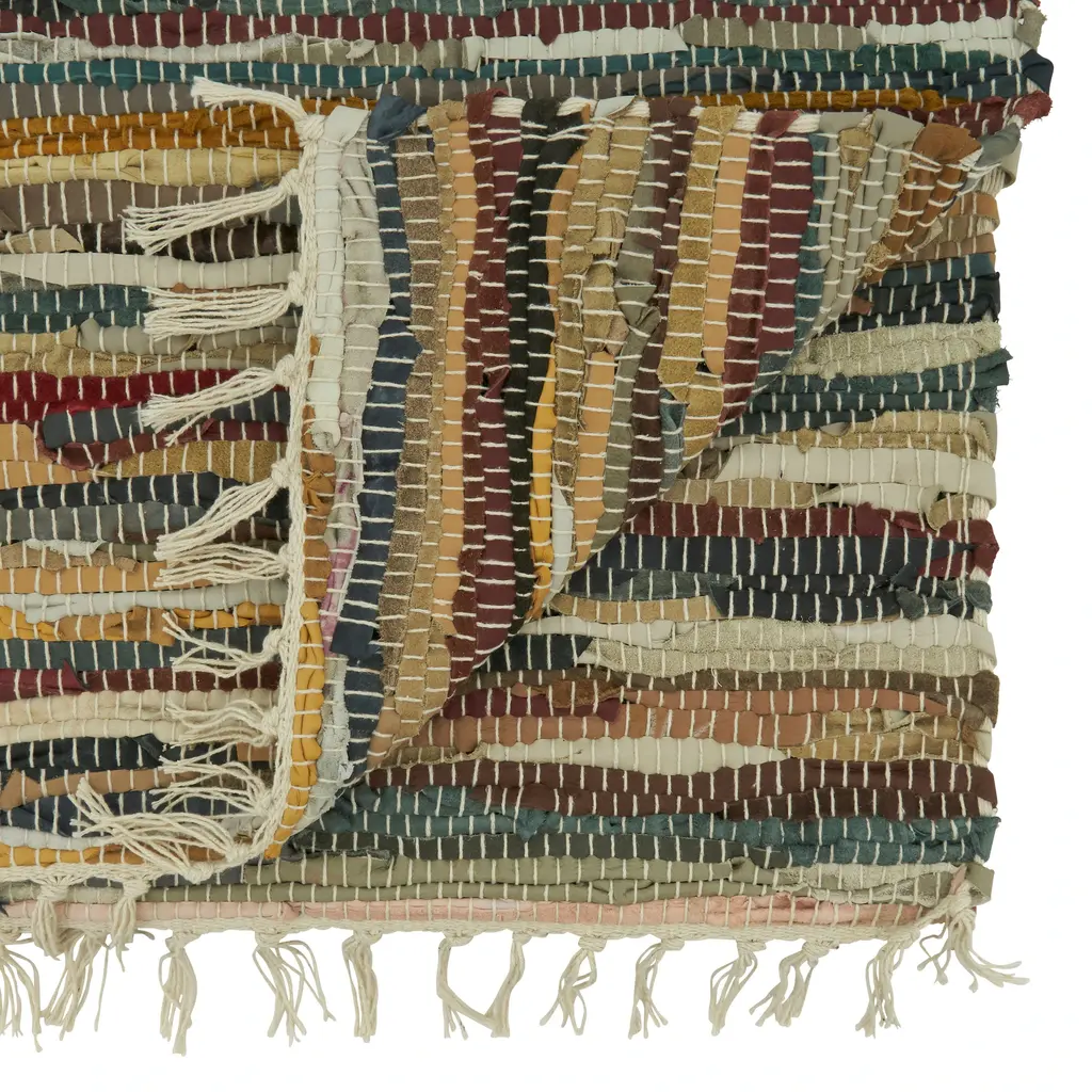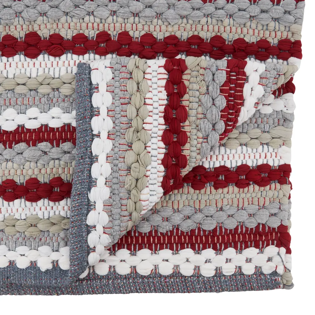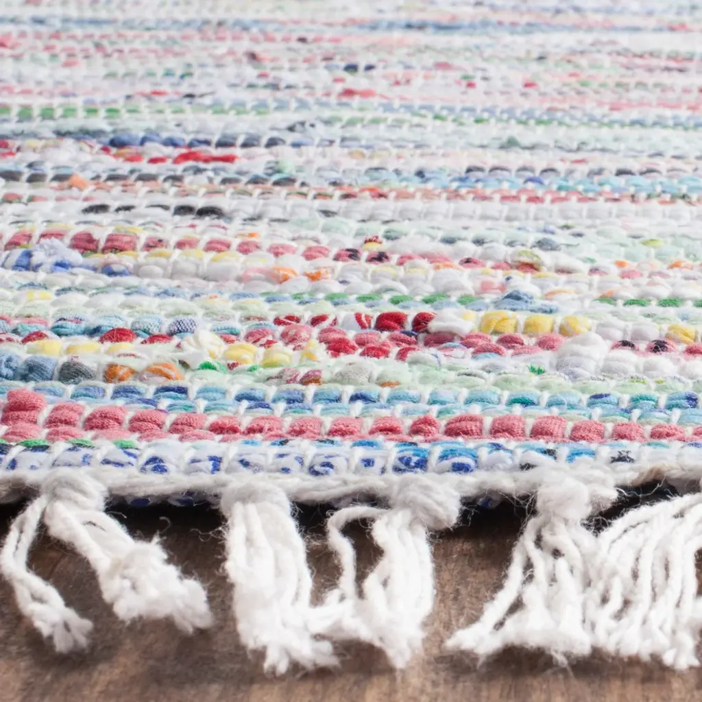 The Rag Rug Collection celebrates thesimple charm of American textile art. Vibrant, trendy colors radiate from the characteristic flat-weave textures of these quintessential American classics. Engaging style and a soft, hand-woven cotton feel underfoot make these lovely rugs the perfect choice to add warm, whimsical character to casually styled room decor.Construction: Hand WovenMaterials: 100% CottonGeneral Care: Use rug protectors under the legs of heavy furniture to avoid flattening of your rug pile. Rotating your rug every few months will help relieve areas from excessive wear. Packing and shipping may cause temporary creases in area rugs. To remove them back-roll/reverse roll your rug and allow time for the creases to relax. Direct sunlight will cause the colors in your area rug to fade over time. Long term exposure to humid weather can be harmful to area rugs. The cotton warp and weft foundation of an area rug can breakdown when exposed to excessive humidity. Avoid placing plants directly on top of area rugs and immediately blot dry any water spillage. Brushing is the best way to remove stubborn pet hairs that the vacuum misses. For short pile area rugs, use a carpet brush or carpet sweeper. For longer pile a carpet rake works well. Sweeping works best for outdoor rugs. The sturdy pile of an indoor-outdoor rug does not trap dirt as readily as other area rugs. For rugs that are relatively easy to handle, bring them outdoors and shake vigorously to remove excess debris. Hang over an outdoor railing and beat with the back of a broom or rug beater, varying in vigor based on the construction and condition of the rug. Area rugs placed in high traffic areas will wear faster than those in lesser tread-upon locations. Rotating a rug every few months will distribute any wear and fading evenly.Vacuuming: Routine vacuuming with a high quality vacuum cleaner is the most important thing you can do to maintain the beauty of your rug. Vacuum thoroughly and frequently with a canister vacuum (preferably one without beater bars). This prevents permanent damage by keeping soil particles from working their way deep into your rug. Rugs placed in high traffic areas of your home or office should be vacuumed more frequently. Never vacuum the fringes of your rug, especially a hand-knotted rug.Cleaning & Removing Stains: Quick action following a spill is essential in order to keep a permanent stain from setting into your rug. For liquid spills, use a clean, undyed cloth and press firmly around the spill to absorb as much as possible. Do not rub! This will cause the stain to set deeper into the rug, making it harder to remove and increasing the likelihood that it will reappear. For hard to remove stains, professional rug cleaning is recommended.