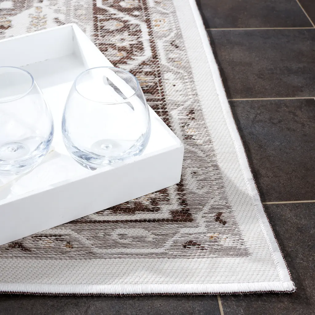 Reinvigorate your outdoor space with the trendy patterns in SAFAVIEH's Sunrise Rug Collection. These rugs have a sleek pile height that allows for seamless placement underneath your SAFAVIEH patio furniture from season to season. A beautiful addition to the backyard, patio, deck, front porch or lanai. Features:Stain, Weather, and UV-Resistant: Machine-woven from enhanced synthetic fibers for virtually no shedding and stain resistanceKid and Pet-Friendly: Safe for high-traffic areas of the home and conveniently kid approved and pet-friendly for life's unpredictable messesTrendy Style: Design beautifully enhances any room, including the patio, deck, kitchen, backyard, porch, dining room, mudroom, veranda, living room, or entrywayEasy Maintenance & Durable: Stress-free cleaning includes regular vacuuming, and rinsing with a garden hose with soapy water and air drying; When not in use for outdoors, we recommend storing awayLow Pile Height: Pile thickness is 0.25-inches for a sleek lookFeatured in SAFAVIEH's Sunrise CollectionFor over 100 years, SAFAVIEH has been crafting rugs of the highest quality and unmatched style.