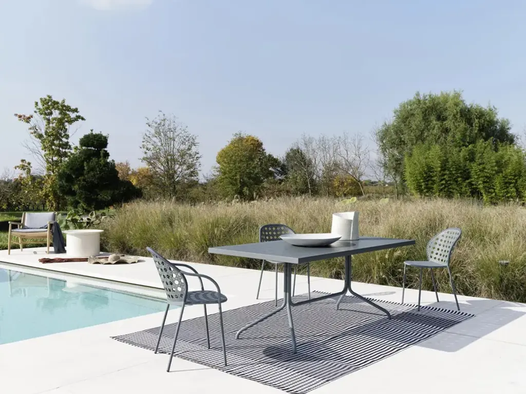 Saha is a polyester yarn rug, PVC coating.The Saha rug by Federica Biasi carries a weave of universal meanings inspired by distant cultures: "earth" in Sanskrit, symbolizing stability and grounding; "thank you" in Maltese, a whisper of gratitude; and in Arabic, “happiness and good fortune.” Made of polyester yarn coated in PVC, the Saha rug combines aesthetics and functionality. The geometric texture of white and blue stripes gives the rug a visual rhythm that suits various settings, from minimalist to eclectic, adding character and depth to spaces.The Gervasoni Outdoor collection is the result of a careful selection of natural and technical materials worked with skillful craftsmanship and innovative technologies. The company’s products adapt to different styles of outdoor living, furnishing – with absolute ease, elegance and free customisation – terraces, gardens or swimming pools, from the most urban and contemporary to the most sophisticated or surrounded by nature. Each place has its own unique character that must be respected and enhanced. The key features of the range are, as always, attention to detail, excellent workmanship and in-depth research into materials.