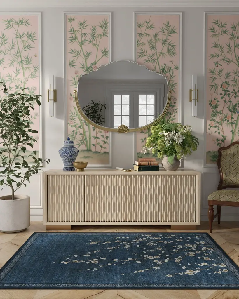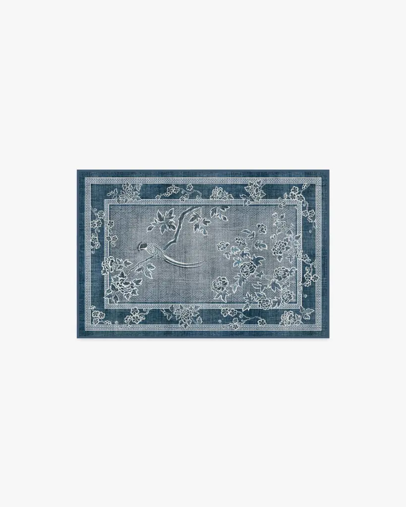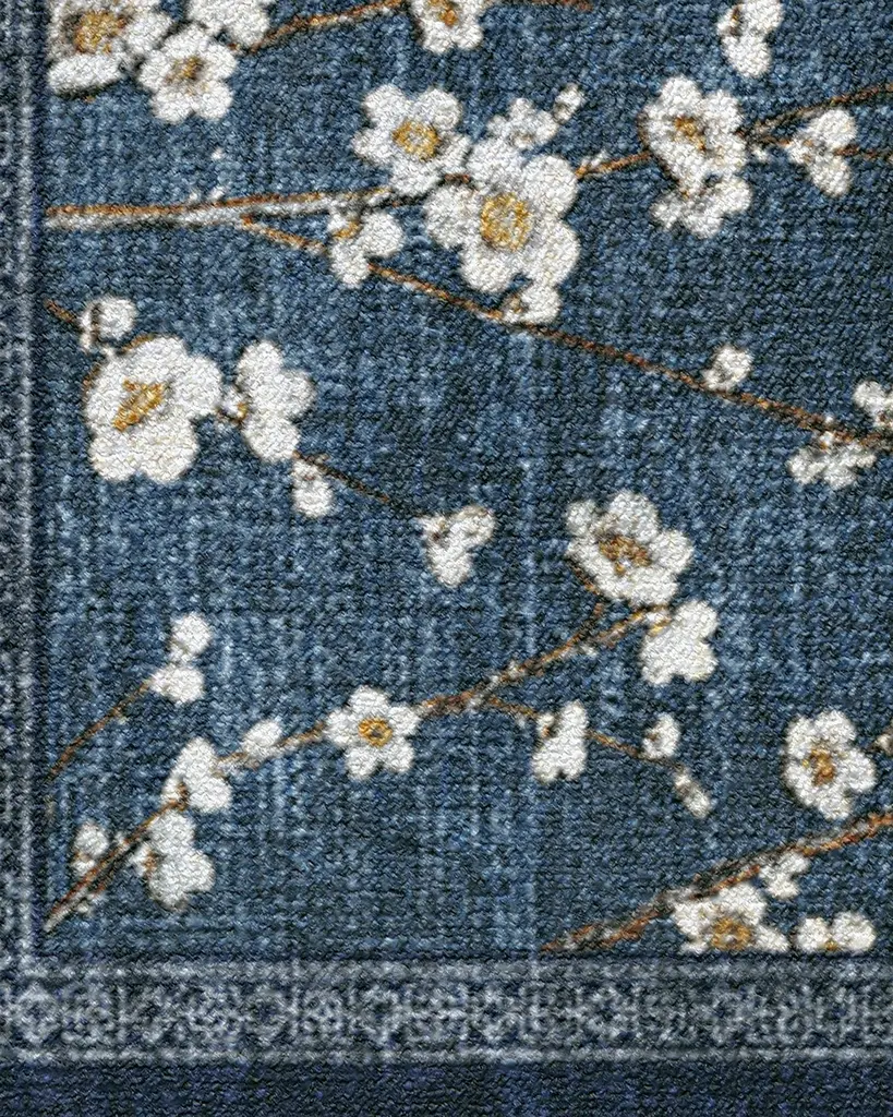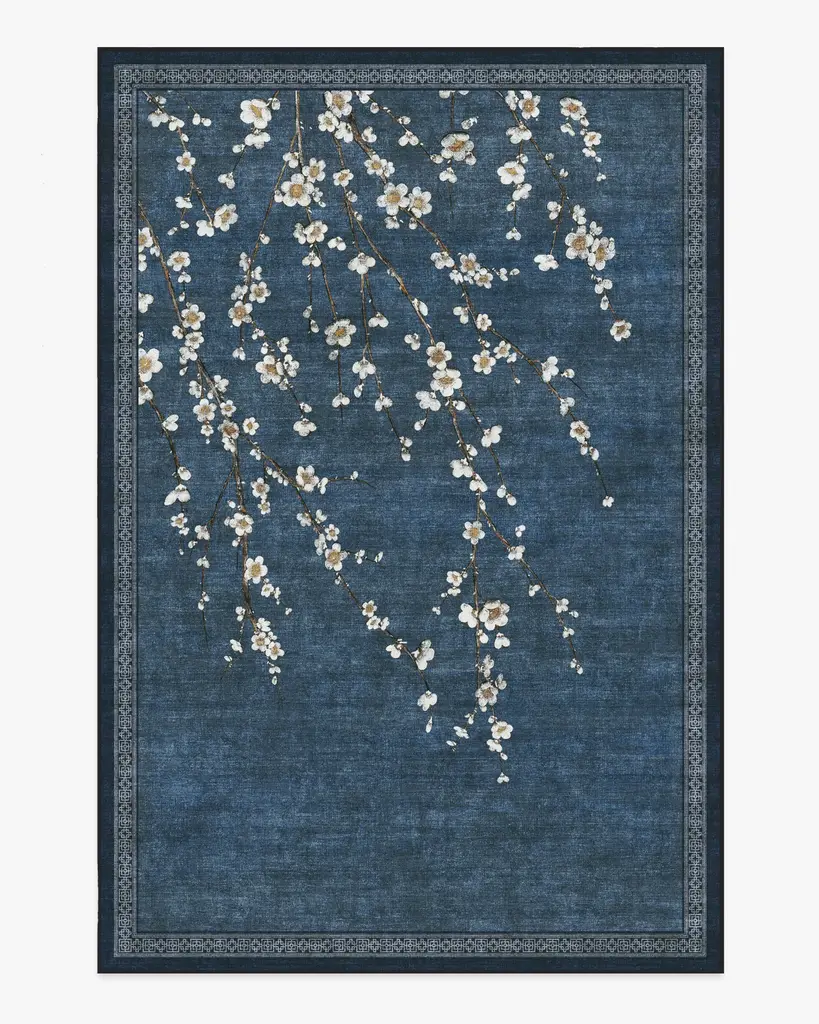 Inspired by the elegance of Japanese sakura trees, our Gracie Sakura Indigo Rug features cherry blossoms cascading from branches at the top of the bordered, textured layout. A warm palette of off-white and cream pops beautifully against the deep navy background. Water-resistant, stain-resistant, and machine-washable. Rug colors may vary slightly according to your device and the lighting in your space.