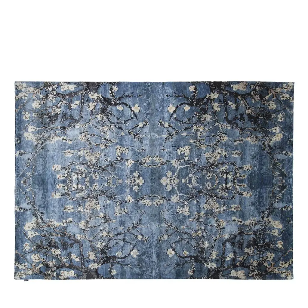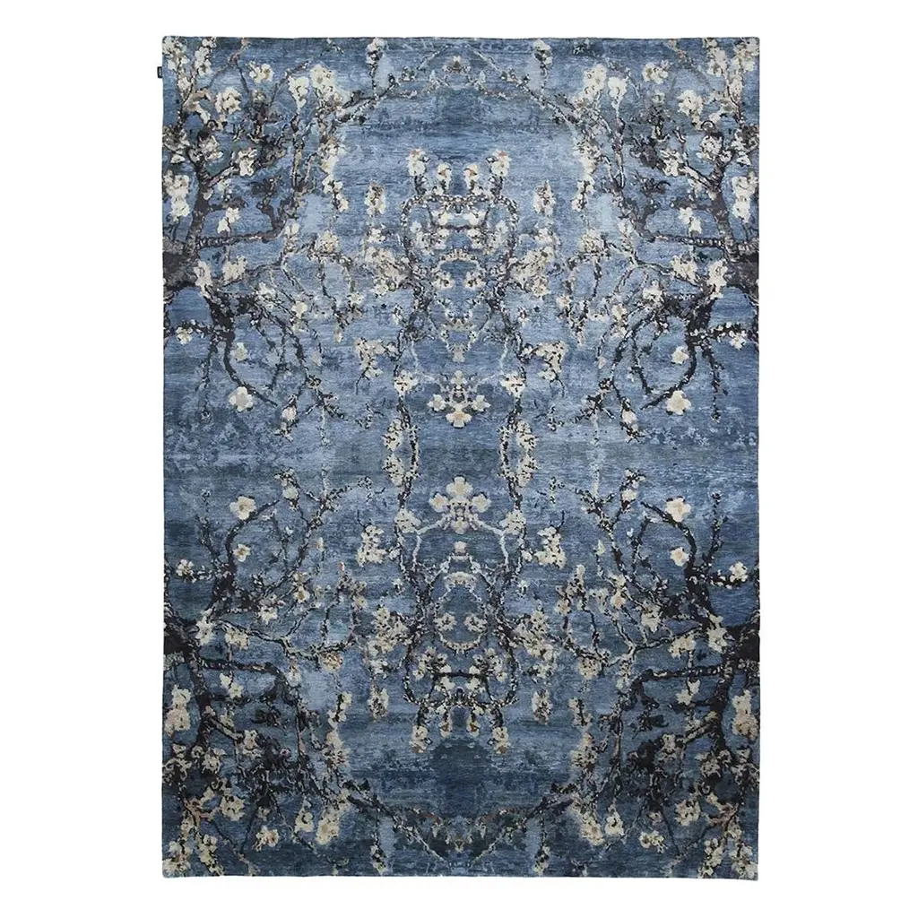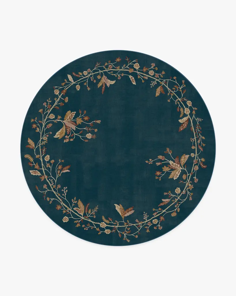 Inspired by the elegance of Japanese sakura trees, our Gracie Sakura Indigo Rug features cherry blossoms cascading from branches at the top of the bordered, textured layout. A warm palette of off-white and cream pops beautifully against the deep navy background. Water-resistant, stain-resistant, and machine-washable. Rug colors may vary slightly according to your device and the lighting in your space.