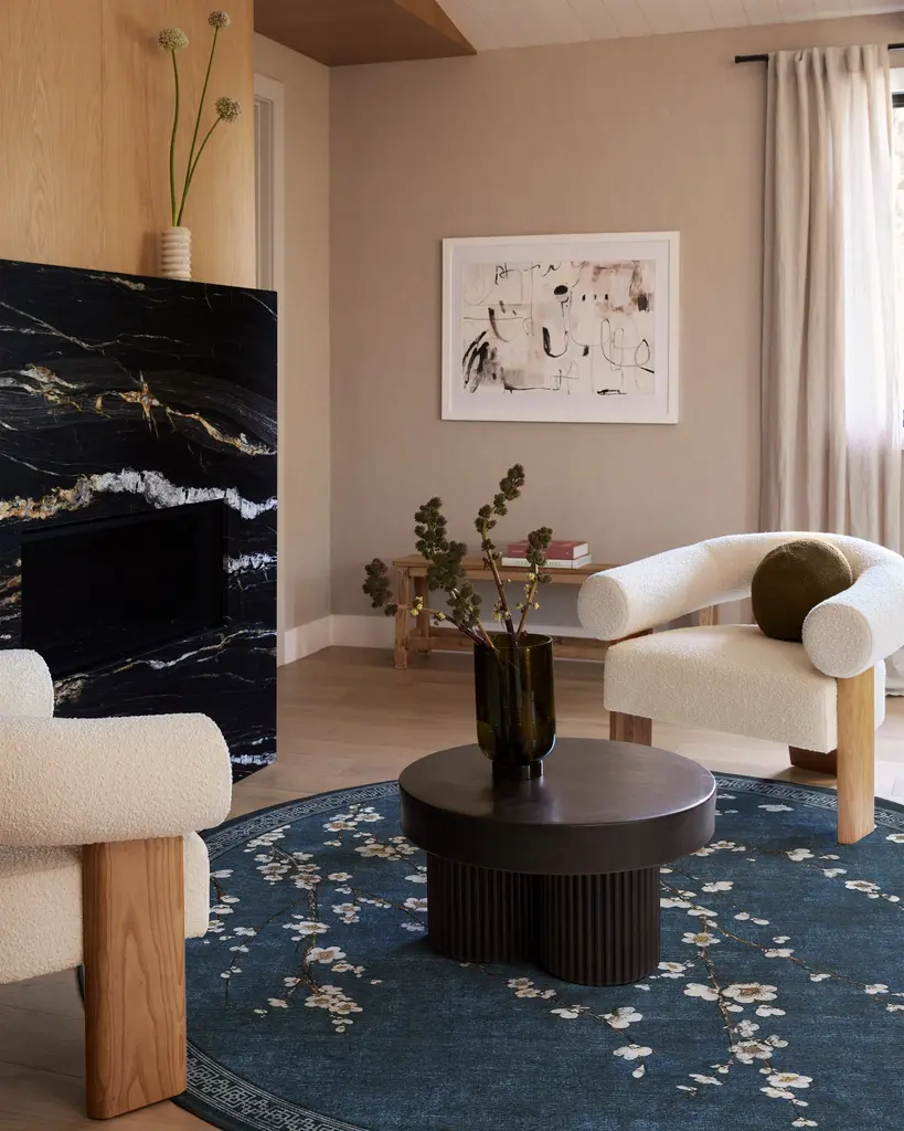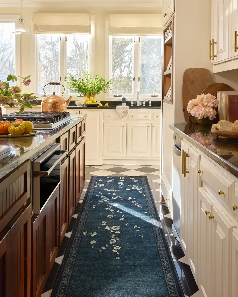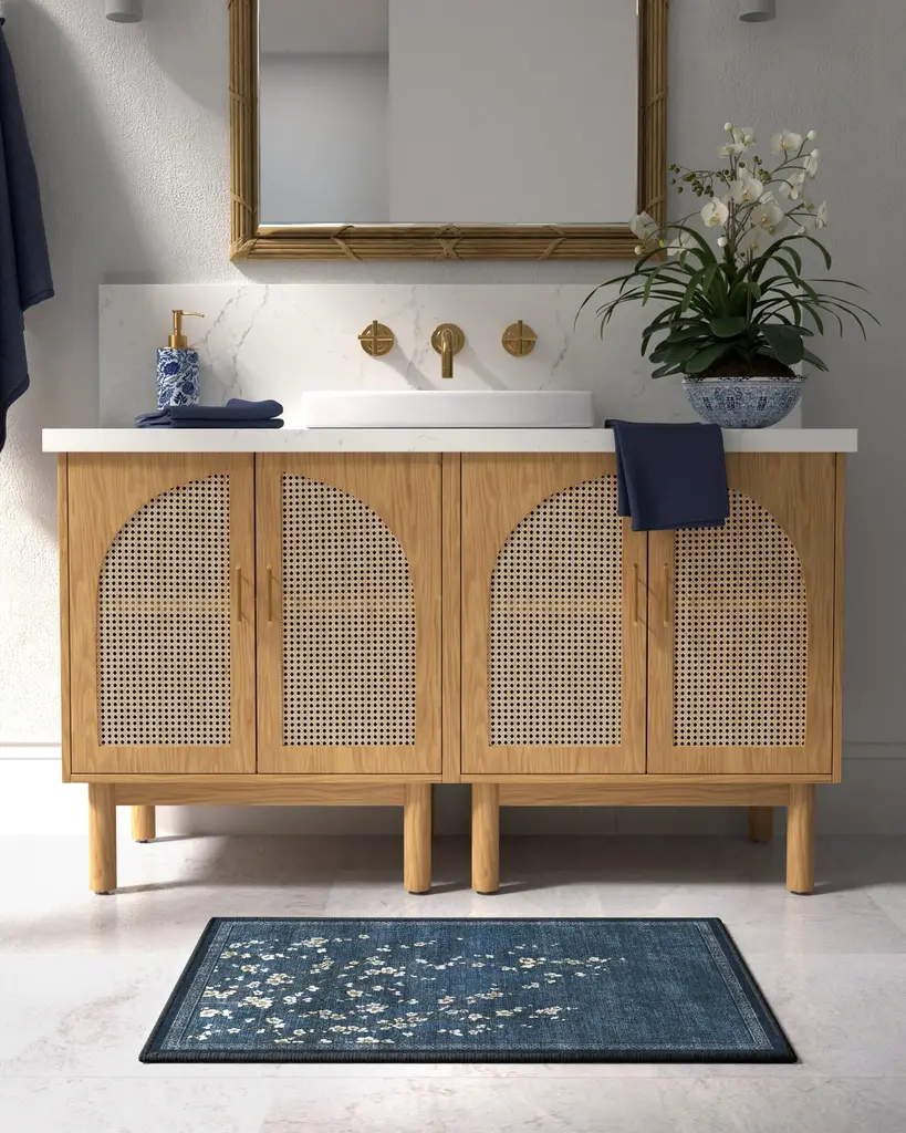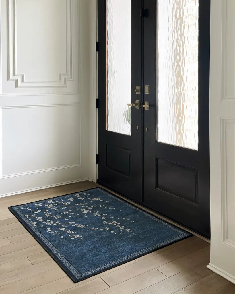 Inspired by the elegance of Japanese sakura trees, our Gracie Sakura Indigo Rug features cherry blossoms cascading from branches at the top of the bordered, textured layout. A warm palette of off-white and cream pops beautifully against the deep navy background. Water-resistant, stain-resistant, and machine-washable. Rug colors may vary slightly according to your device and the lighting in your space.