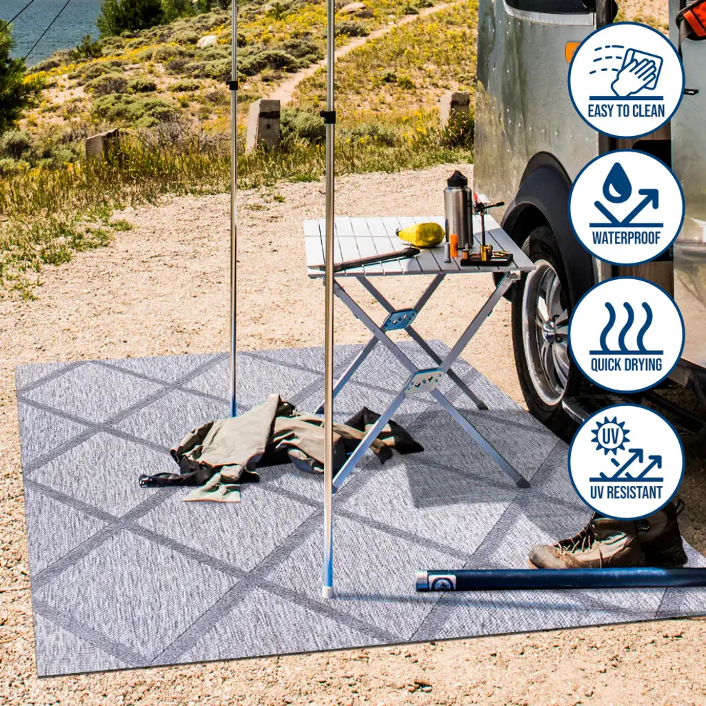 Inspired by timeless Mediterranean patterns, this indoor-outdoor rug adds neutral gray tones to a kitchen, living room, bedroom or dining room. The light gray trellis design is an easy maintenance solution for homes with kids and pets. Outdoors, this rug adds classic color and traditional pattern to your patio or porch.Features:• Power loomed in a low pile that''s soft and durable, with a latex backing for added stability• Woven in shades of gray with mingled threads for a handmade effect• Made from easy-care polypropylene - just sweep, vacuum or hose down with mild soap and water• 100% Polypropylene• No backing, use of rug pad is recommended (sold separately)• Power Loomed in Turkey• Actual Dimension: 5 ft. 3 in. x 5 ft. 3 in. Square• Color: Light Gray• Thickness measures: 0.43 in.• Available in multiple sizes and/or colorsRug Care:• Vacuum regularly and spot clean as needed; avoid direct and continuous exposure to sunlight; use brushless vacuum; remove spills immediately; if liquid, blot with clean, undyed cloth by pressing firmly around the spill to absorb as much as possible; for hard to remove stains, professional rug cleaning is recommended; store in a dry, well ventilated area and rotate for consistent wear• Packing and shipping may cause temporary creases in rugs, which will flatten out after a week on the floor; to expedite the process, try back-rolling your rug before laying it down, and then allow ample time for the remaining creases to relax• Please Note: Due to differences in monitors, some rug colors may vary slightly. Lengths and widths may vary from the published dimensions. Patterns may vary slightly according to shape and size selected.