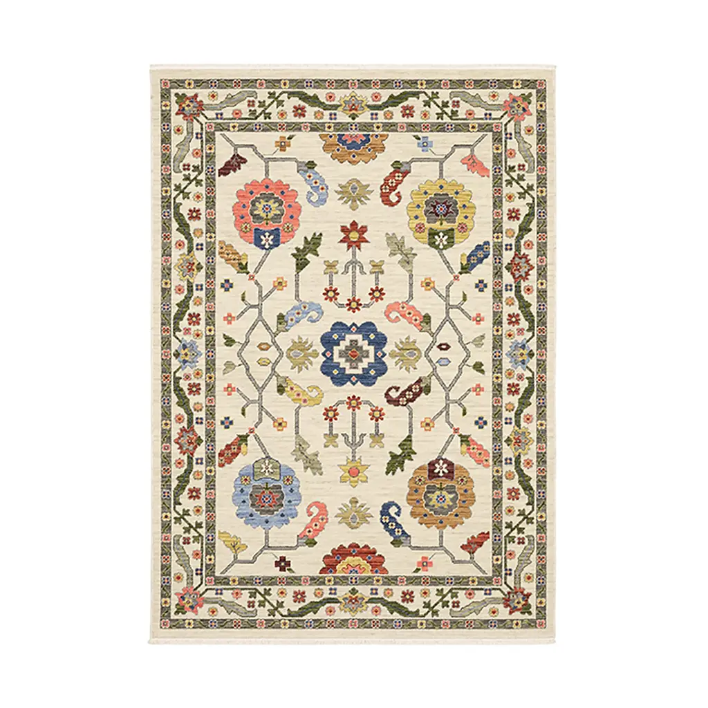 Beautifully detailed in design and skillfully cross-woven, the Saluda Jewels Wool Rug embellishes any room with style, warmth and grace. Cross-woven on an Axminster loom using space-dyed wool and nylon, this rug has a strong, three-dimensional structure more durable than tufted carpet. The Axminster method produces a high-performance rug while also allowing for the creation of complex designs incorporating a multitude of color combinations. The unique design and vivid colors of this rug give it an antique yet modern-living look. The exceptional wearability and durability make it great for high-traffic areas and your family's favorite rooms, such as bedrooms, family rooms, living rooms and more. A traditional border and pretty floral details complement the look and give it one-of-a-kind styling power. Edges are accentuated with incorporated fringe. Sizes are approximate, and patterns will vary slightly by size. Imported.