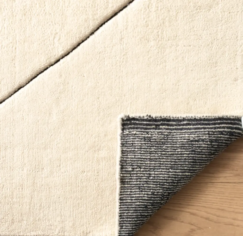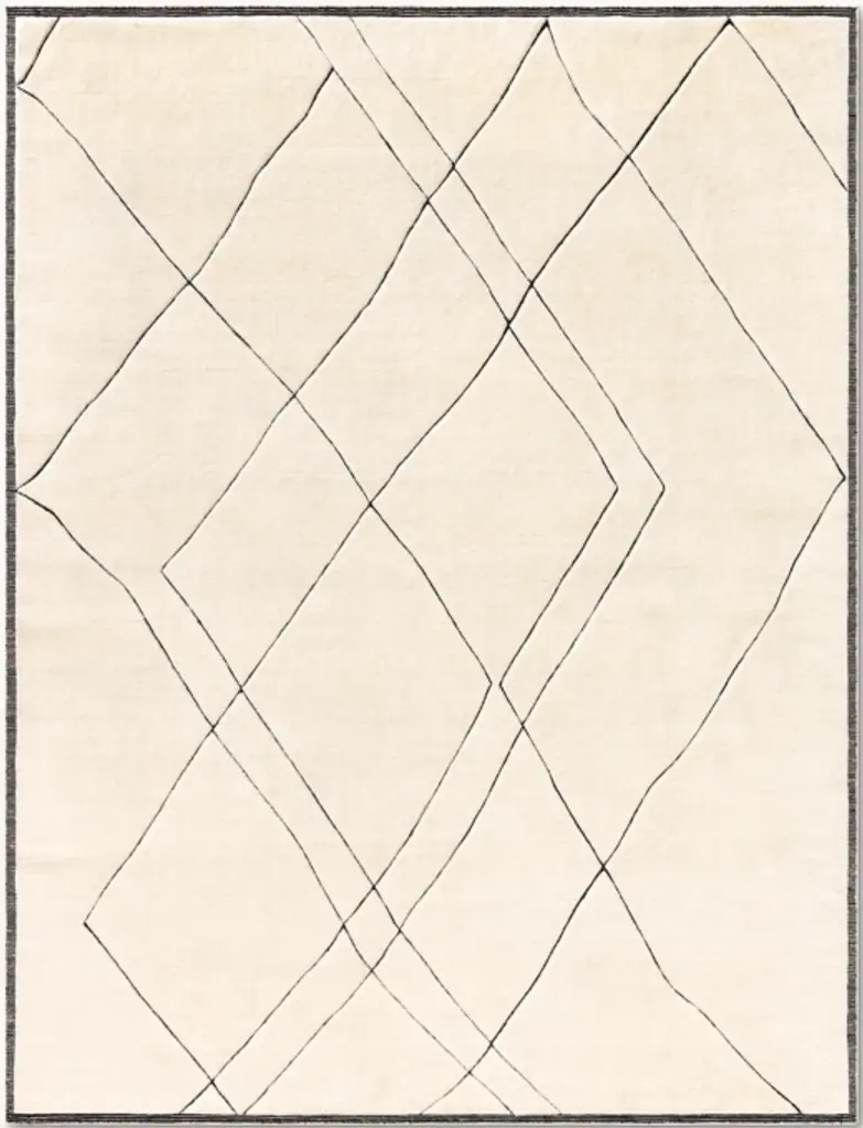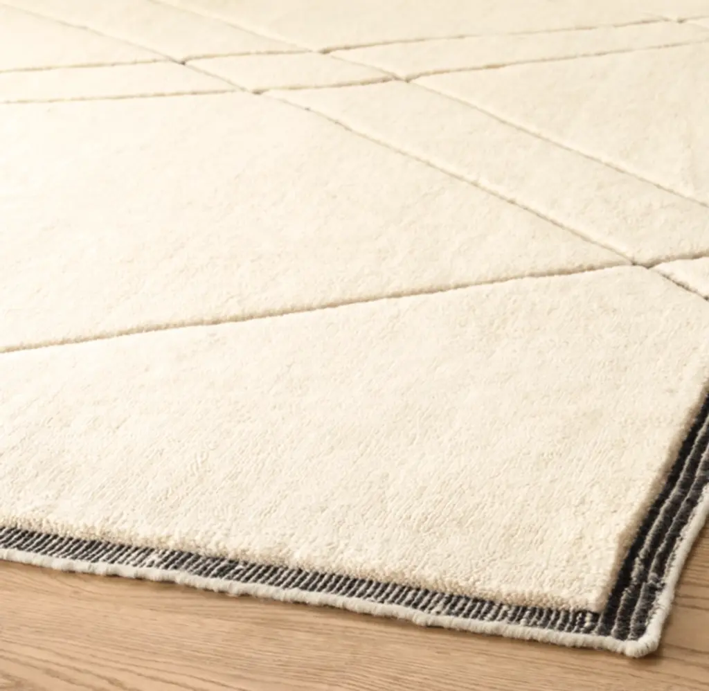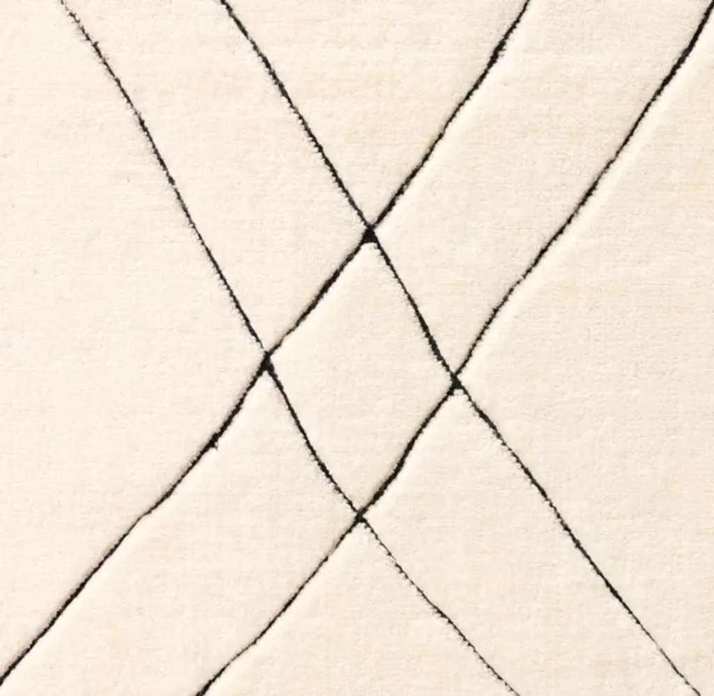 Sketched diamonds trace an abstract composition in Samira's soft pile. Rich in abrash shading, hand-spun New Zealand wool is woven on traditional handlooms and finished with tonal flatweave borders.