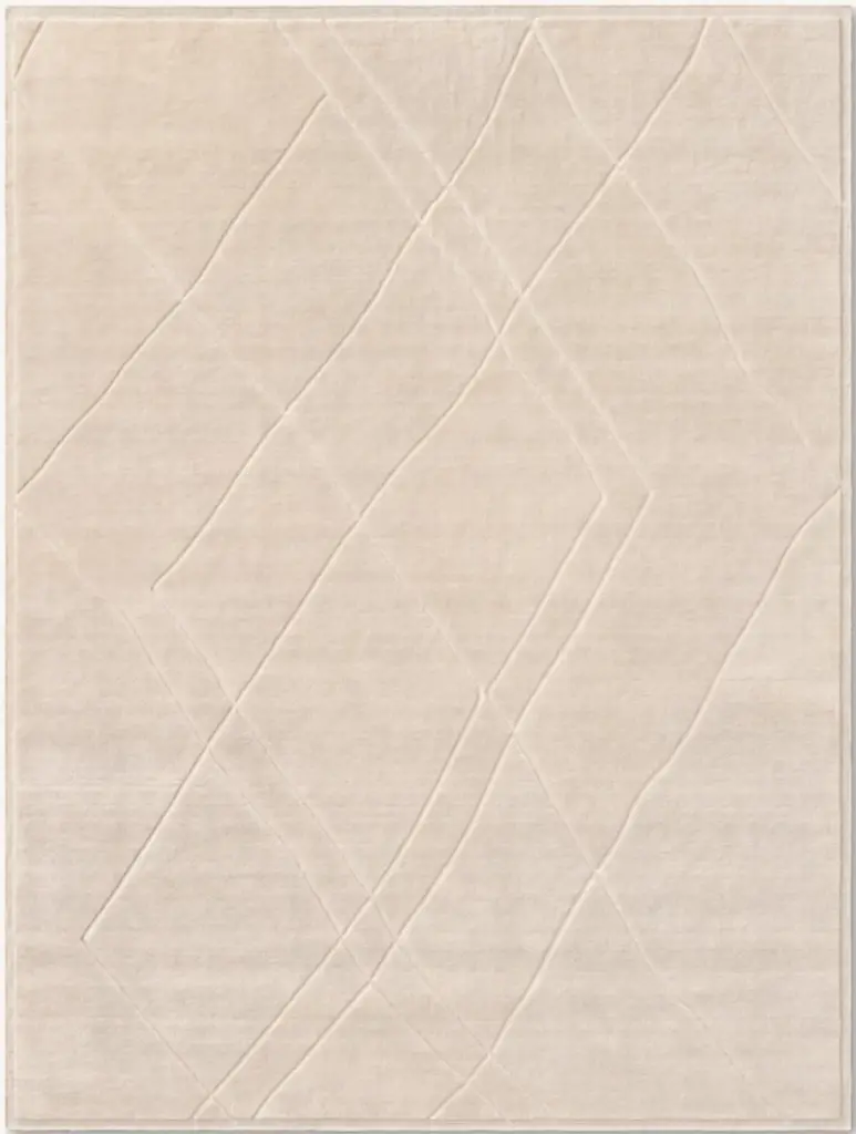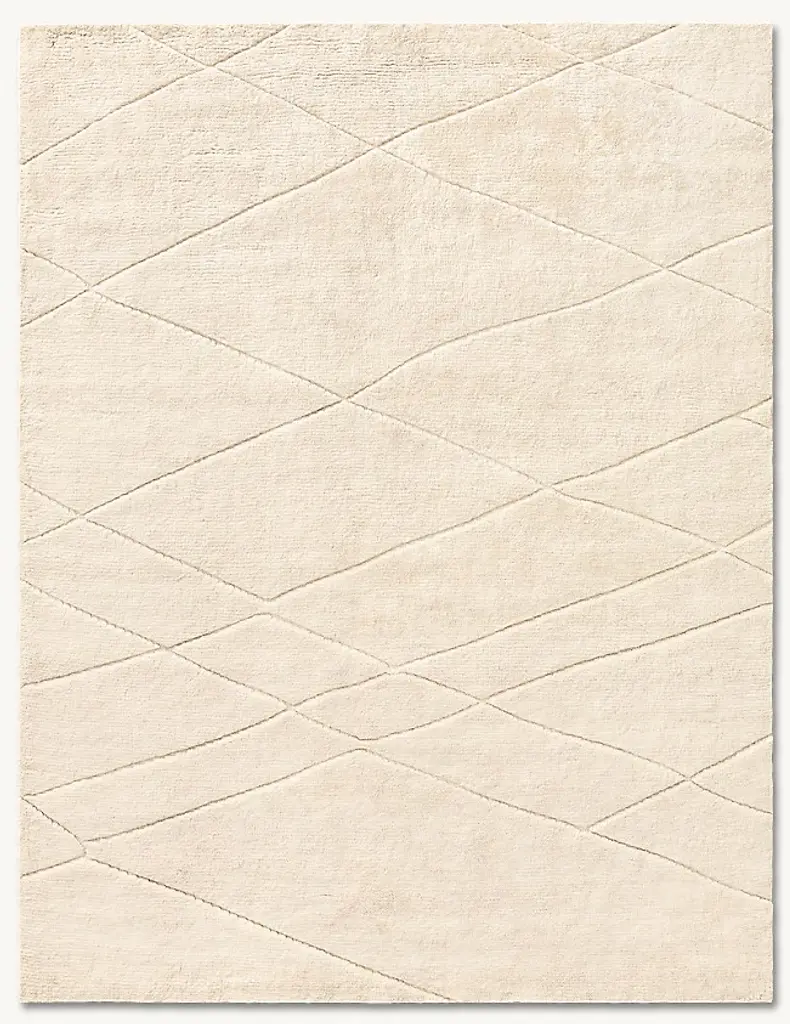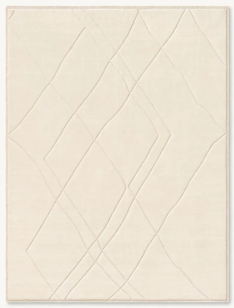 Sketched diamonds trace an abstract composition in Samira's soft pile. Rich in abrash shading, hand-spun New Zealand wool is woven on traditional handlooms and finished with tonal flatweave borders.