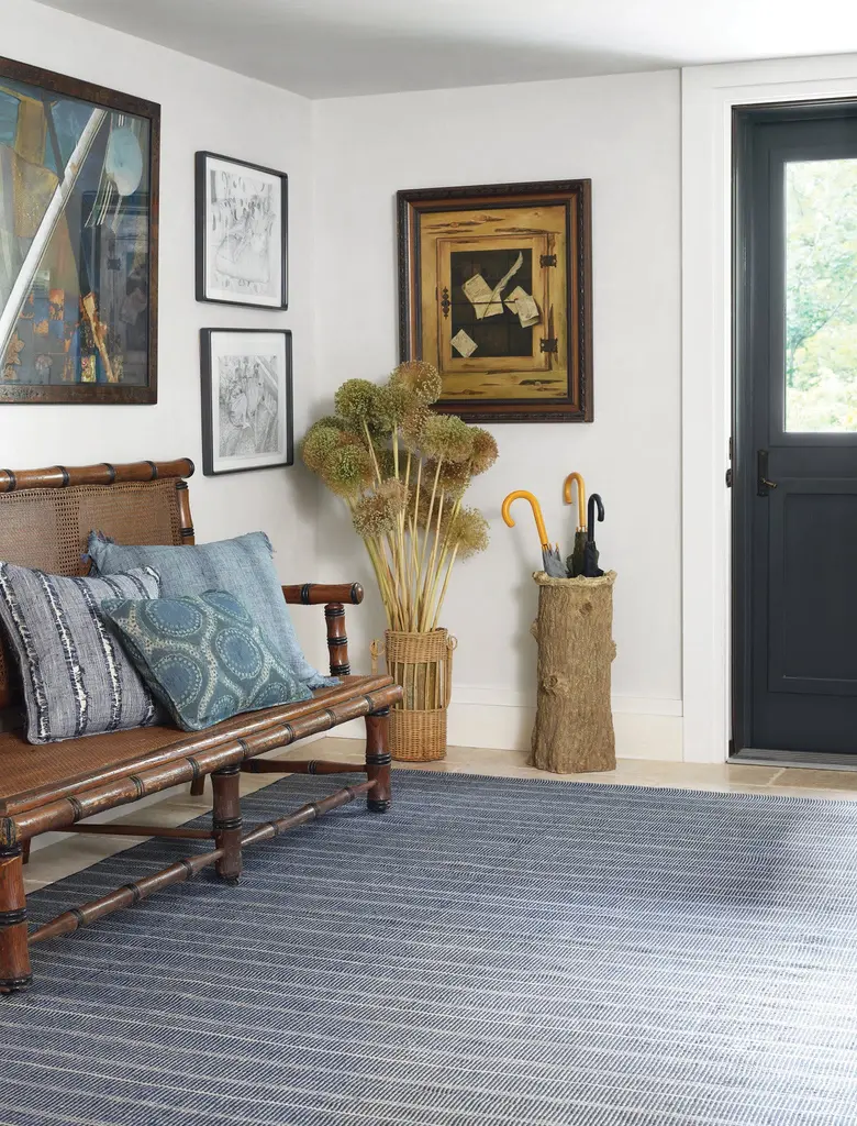 The Samson Handwoven Indoor/Outdoor Rug is a part of our Bunny Williams collection. Inspired by an antique rug sample from the designer's own personal collection, this fade-resistant rug is woven using an eco-friendly polyester fiber crafted from recycled plastic bottles. It's lightweight, low profile, and reversible. Washable and scrubbable, this rug is just right for high-traffic areas, porches, and patios.