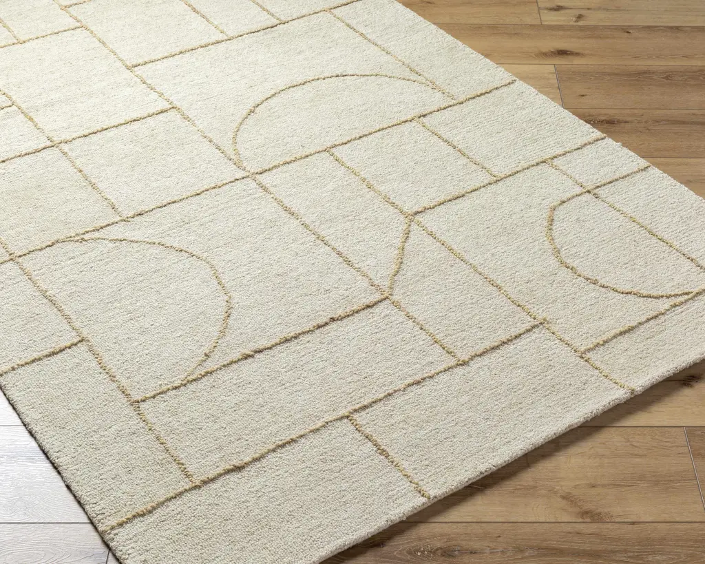 Collection: Sanaz Colors: Ash, Tan Construction: Hand Tufted Material: 100% Wool Pile: Medium Pile Pile Height: 0.28" Styles: Contemporary Backing: Canvas Made In: India Thickness: 0.51" Price Range: $$$$$ (Affordable)