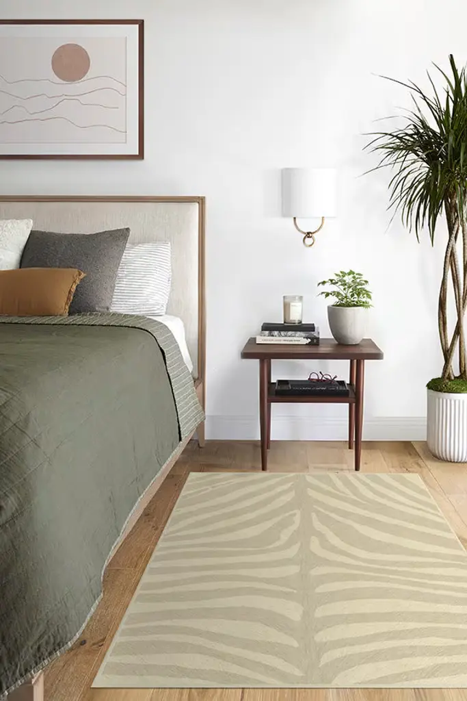 Elevate your style with our understated Sand Zebra Faux Hide Rug. Made from a cushioned, medium-pile polyester and polyurethane material, this elegant neutral features a warm, natural stripe on a pale tan background. Durable, shed-resistant, and machine-washable.