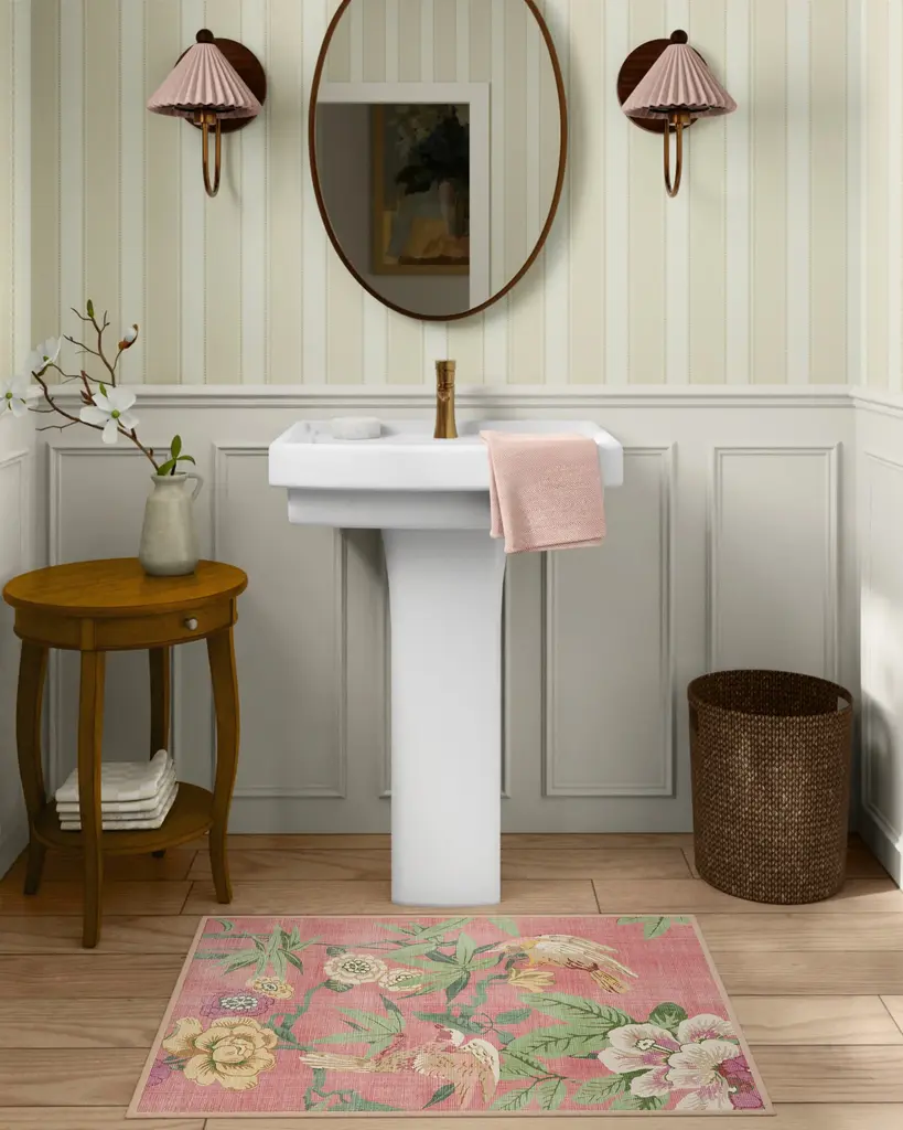 Bring home the tropics with our Sanderson Bamboo & Bird Blossom Pink Rug. Delicate bamboo, hibiscus, hydrangea, and wisteria motifs create a twisting framework for birds to perch. Its palette blends greens, magentas, pinks, neutrals, yellows, and beiges, with pops of light cream against a pink coral background. Water-resistant, stain-resistant, and machine-washable. Rug colors may vary slightly according to your device and the lighting in your space.