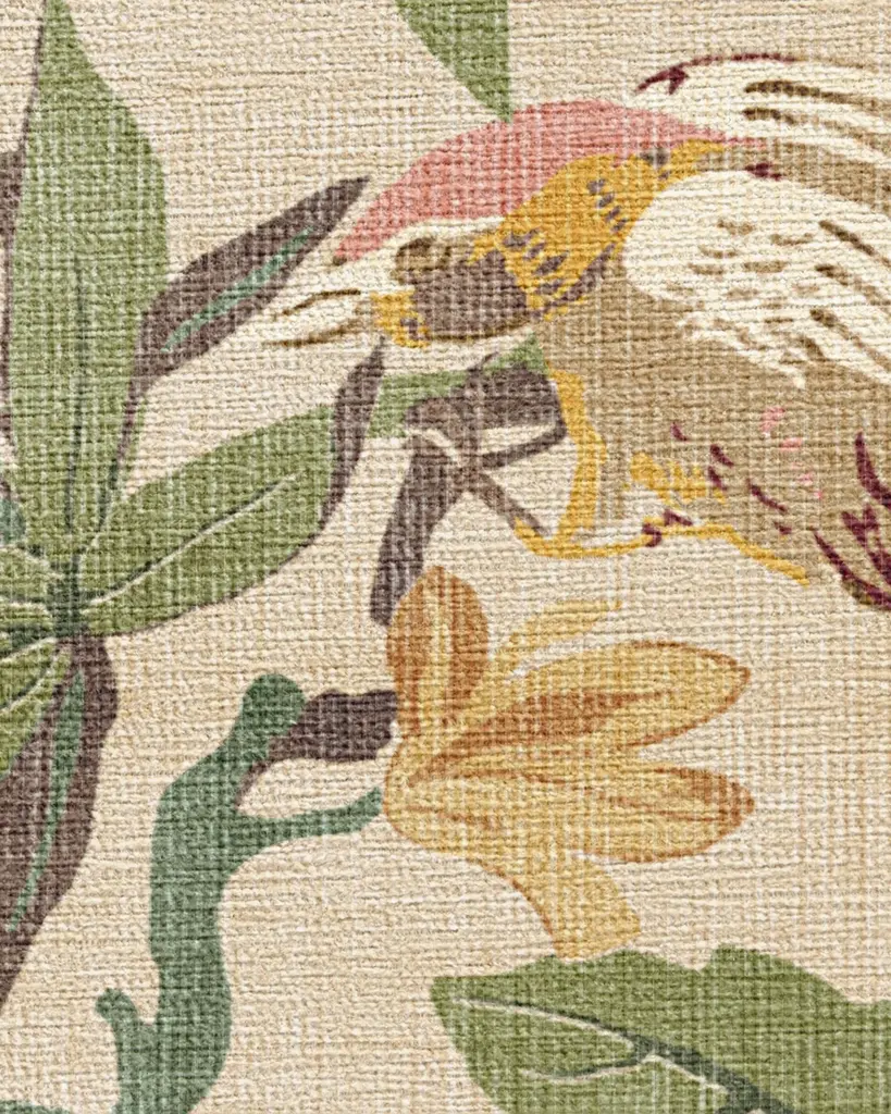 Bring home the tropics with our Sanderson Bamboo & Bird Blush & Jade Rug. Delicate bamboo, hibiscus, hydrangea, and wisteria motifs create a twisting framework for birds to perch. Its palette blends olive greens, teal blues, bright teal accents, browns, yellows, magentas, and pinks, with pops of bright cream against a light cream background. Water-resistant, stain-resistant, and machine-washable. Rug colors may vary slightly according to your device and the lighting in your space.