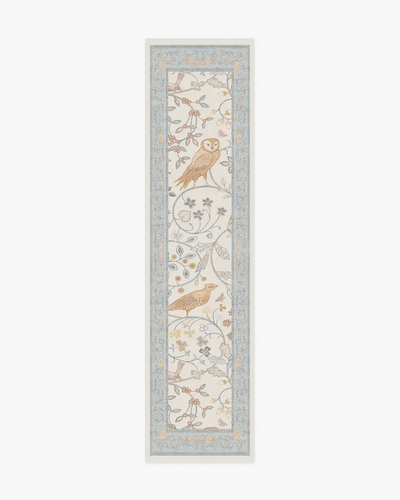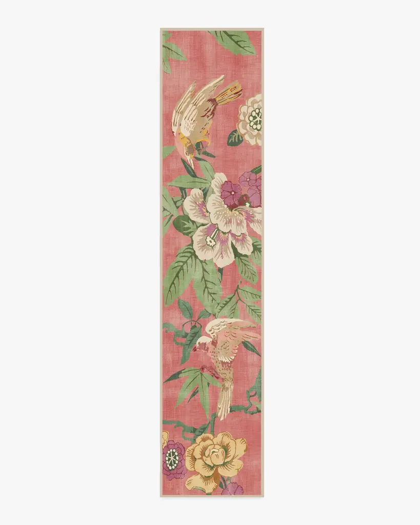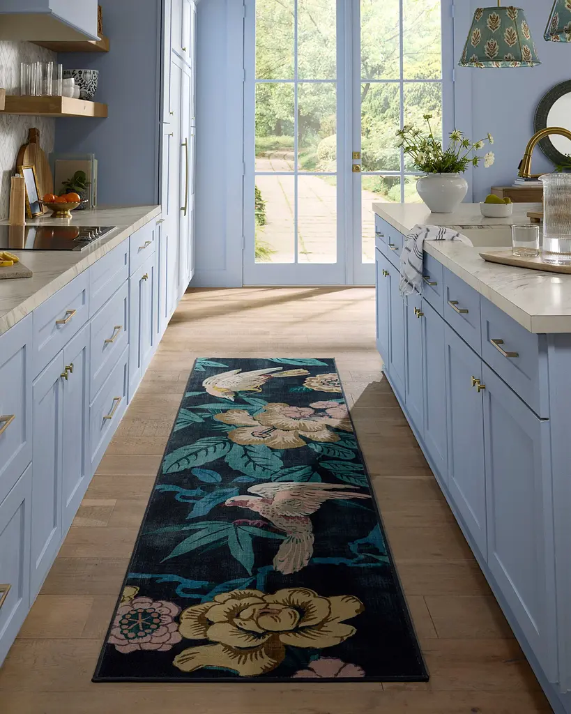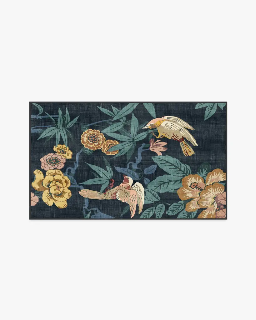 Bring home the tropics with our Sanderson Bamboo & Bird Indigo Rug. Delicate bamboo, hibiscus, hydrangea, and wisteria motifs create a twisting framework for birds to perch. Its palette blends turquoise and bright blues, yellows, ochres, oranges, pinks, corals, and beiges, with pops of light cream against a deep indigo blue background. Water-resistant, stain-resistant, and machine-washable. Rug colors may vary slightly according to your device and the lighting in your space.
