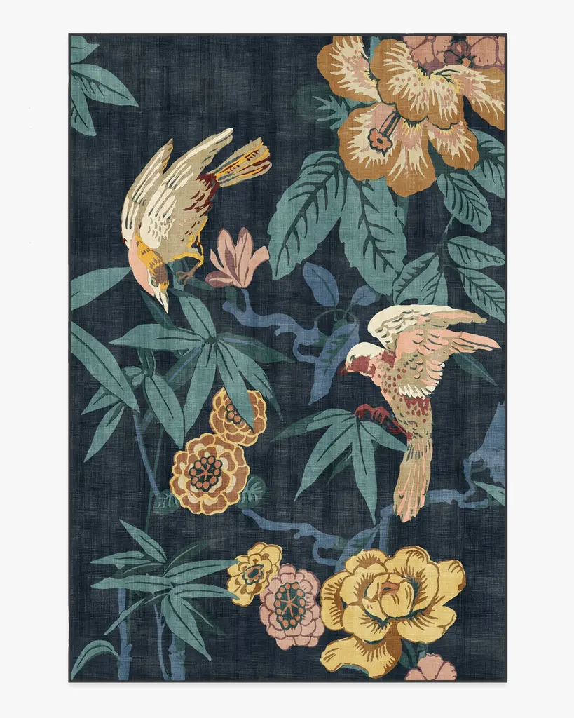 Bring home the tropics with our Sanderson Bamboo & Bird Indigo Rug. Delicate bamboo, hibiscus, hydrangea, and wisteria motifs create a twisting framework for birds to perch. Its palette blends turquoise and bright blues, yellows, ochres, oranges, pinks, corals, and beiges, with pops of light cream against a deep indigo blue background. Water-resistant, stain-resistant, and machine-washable. Rug colors may vary slightly according to your device and the lighting in your space.