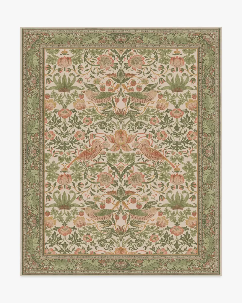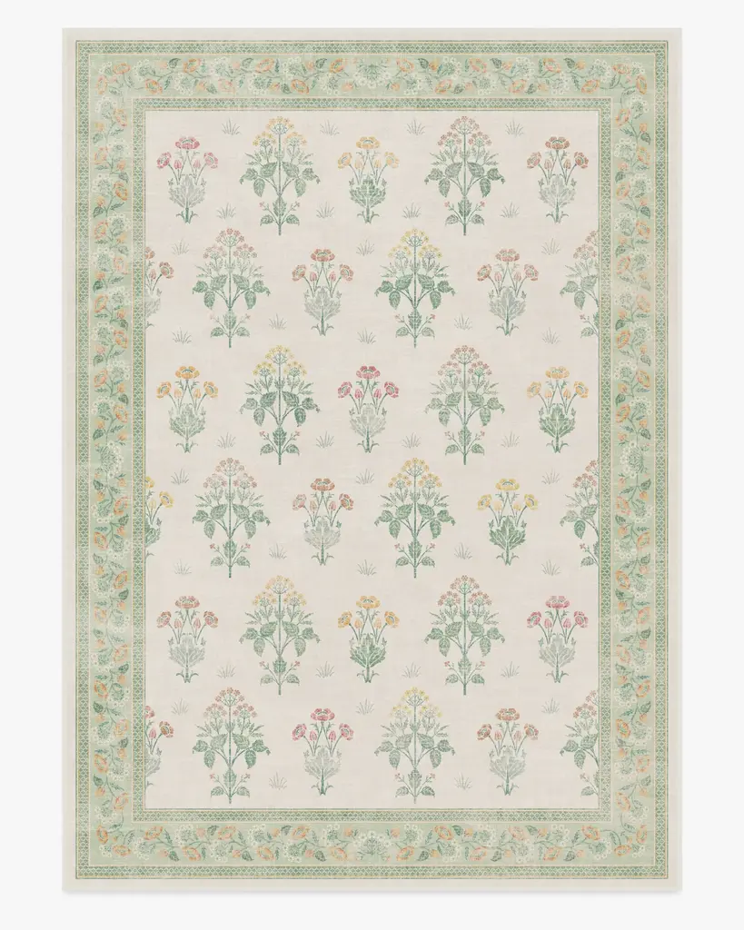 Welcome whimsy with our Sanderson Bird of Paradise Silver Fern Rug. Inspired by Sanderson's Bird of Paradise pattern, this design features motifs of birds, orchids, foliage, and feathers that evolve into an organic border. The palette beautifully blends shades of magenta, pink, green, yellow, and brown against a subtle gradient sage background. Water-resistant, stain-resistant, and machine-washable. Rug colors may vary slightly according to your device and the lighting in your space.