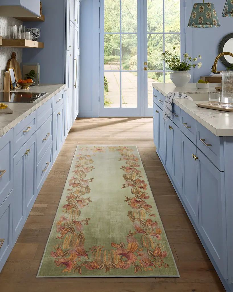 Welcome whimsy with our Sanderson Bird of Paradise Silver Fern Rug. Inspired by Sanderson's Bird of Paradise pattern, this design features motifs of birds, orchids, foliage, and feathers that evolve into an organic border. The palette beautifully blends shades of magenta, pink, green, yellow, and brown against a subtle gradient sage background. Water-resistant, stain-resistant, and machine-washable. Rug colors may vary slightly according to your device and the lighting in your space.