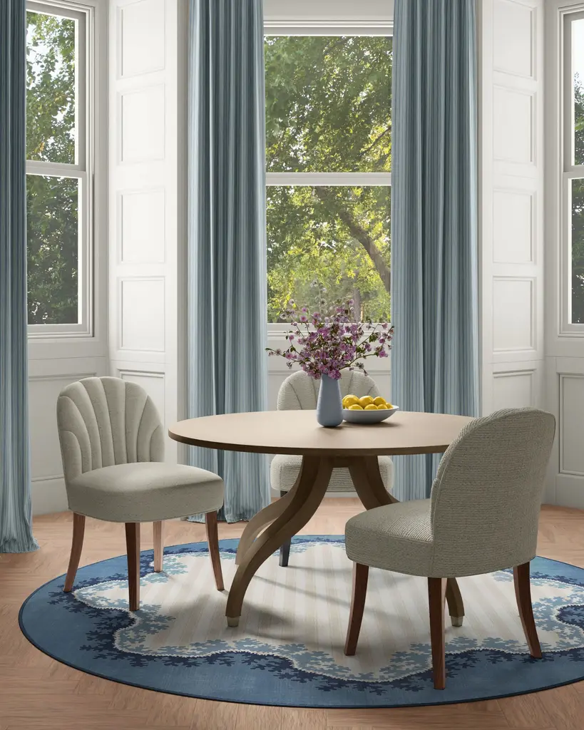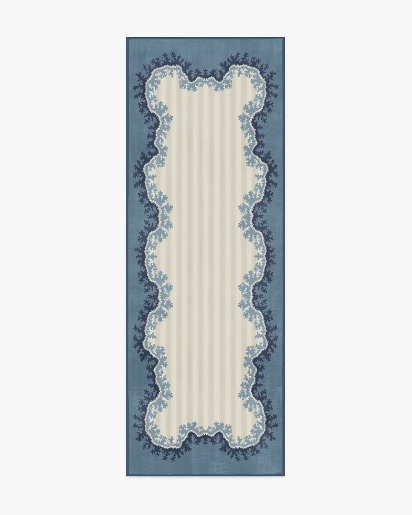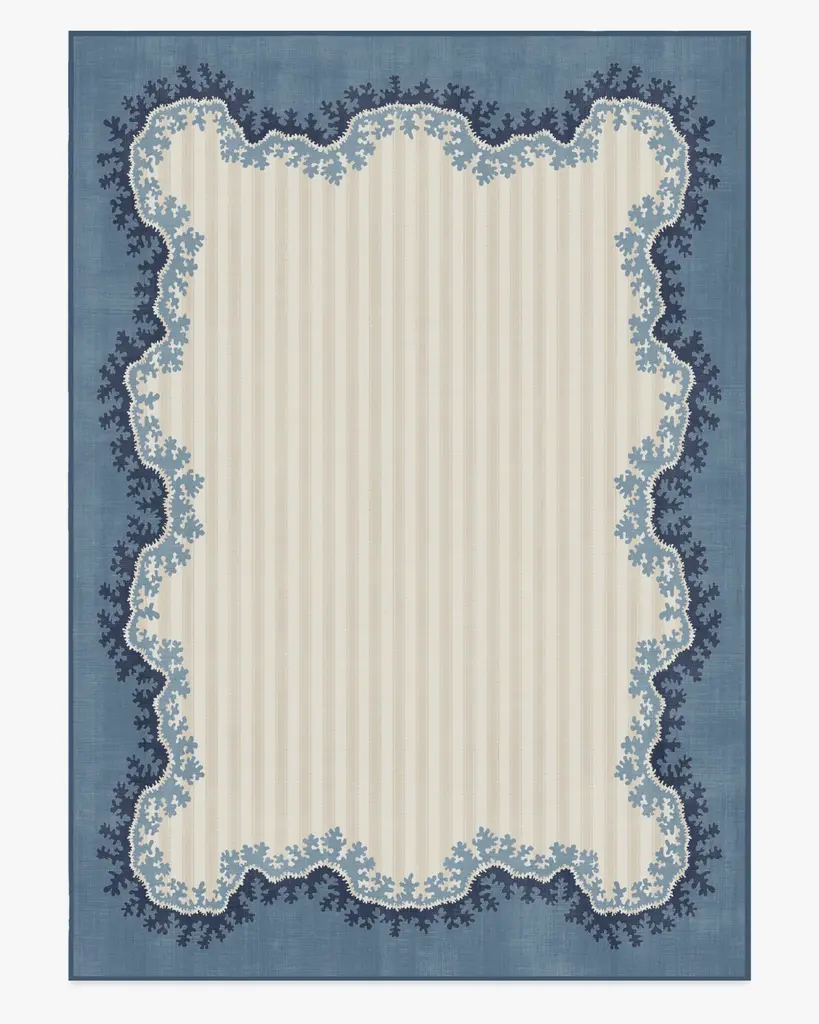Let imagination in with our Sanderson Oxbow Indigo Rug. Referencing Sanderson’s Oxbow pattern, a stylized river design, this rug features tonal stripes and a contrasting organic border that beautifully frames the motif. Shades of slate blue and navy add depth and dimension to the cream and ivory striped background. Water-resistant, stain-resistant, and machine-washable. Rug colors may vary slightly according to your device and the lighting in your space.