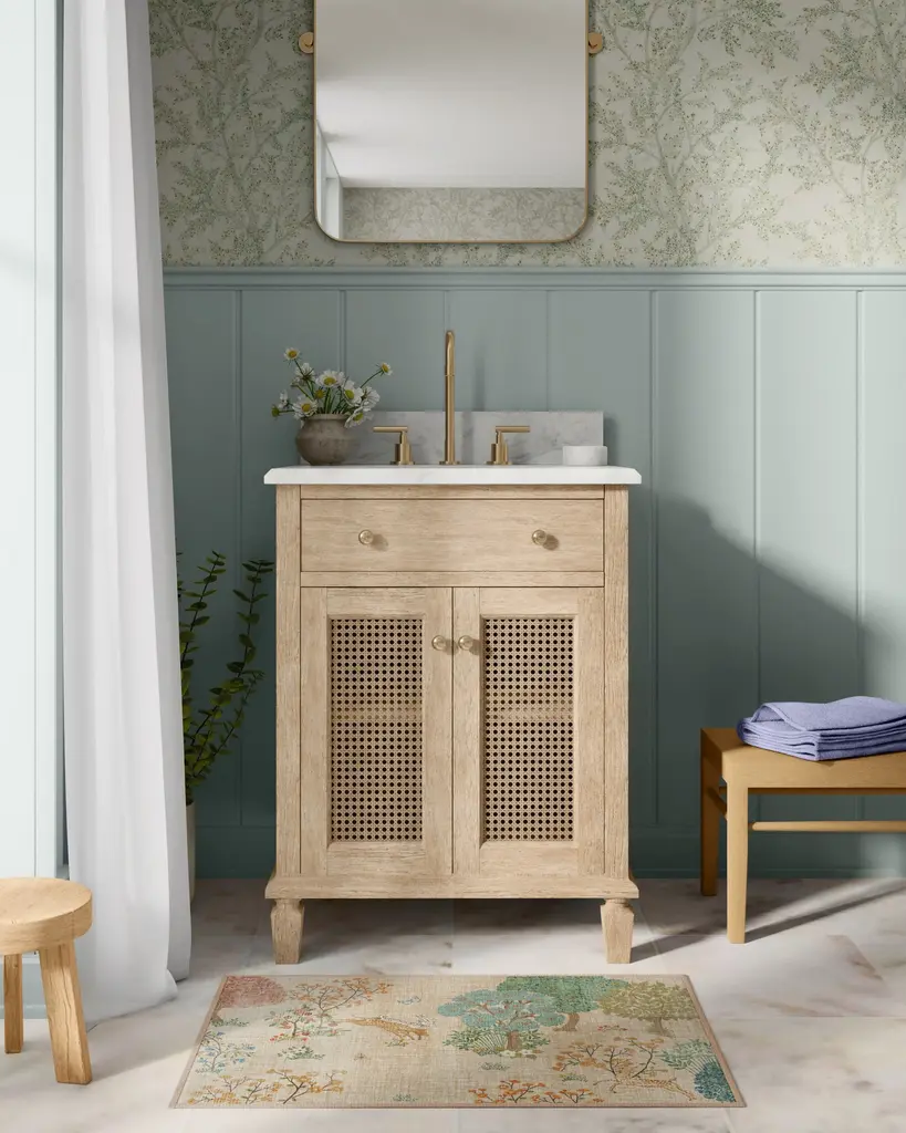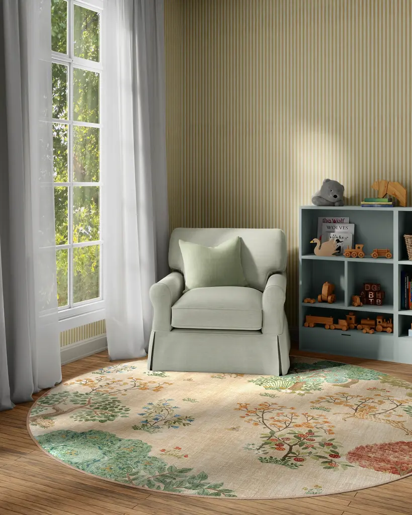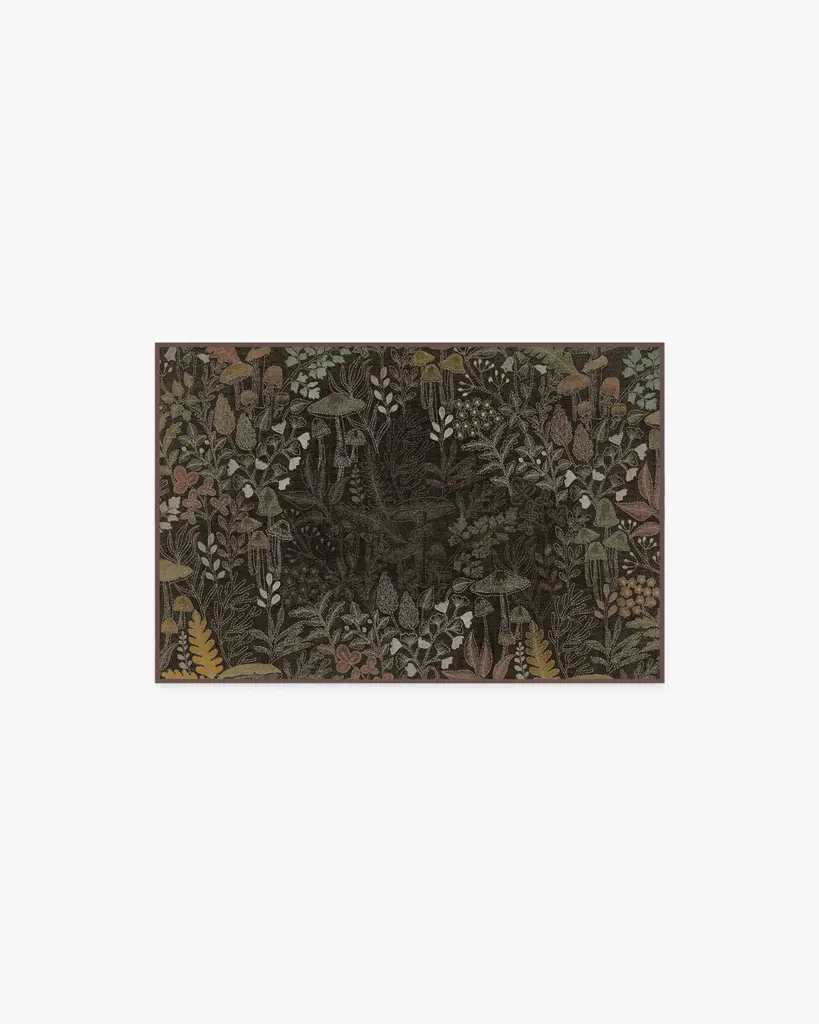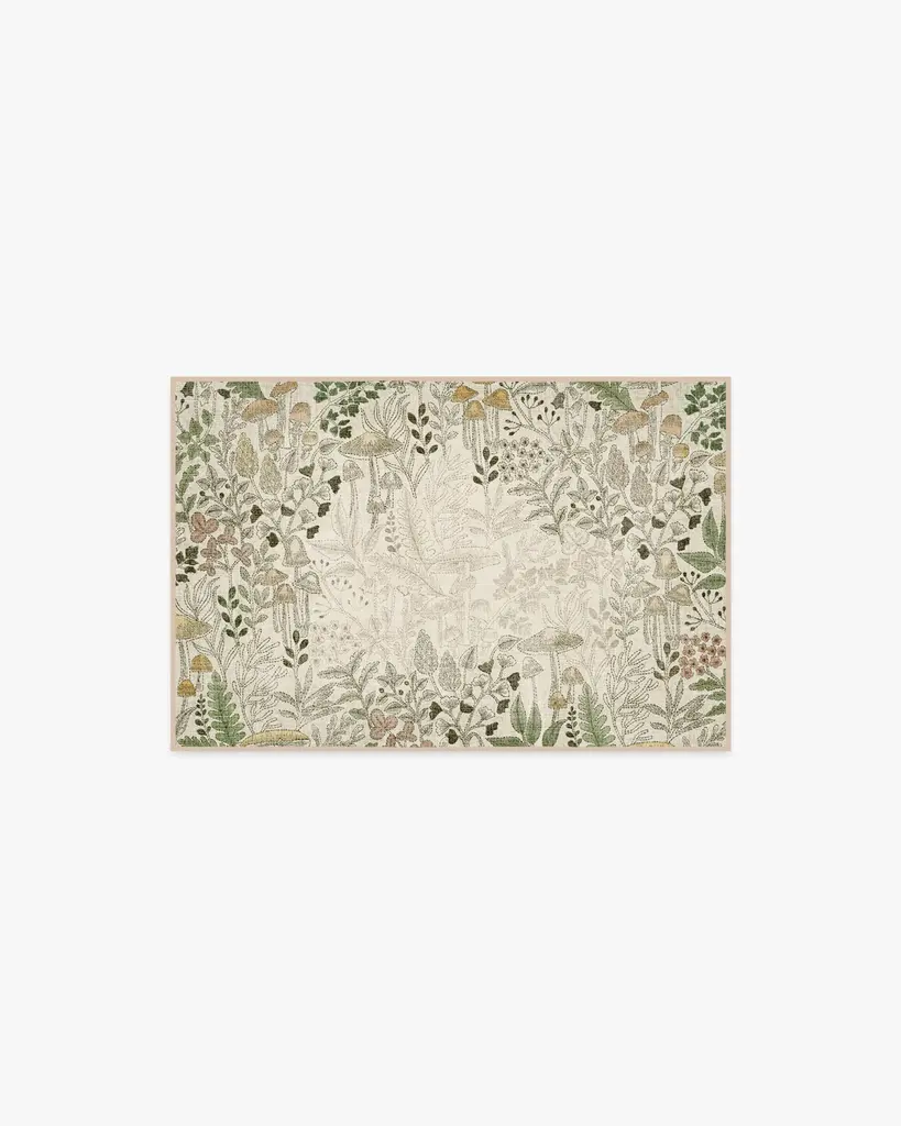 Transform your home with the charming patterns and wild woodland treasures of our Sanderson Pamir Garden Fern Rug. Referencing two Sanderson designs, Pamir Garden and Foraging, this design features a scene of floral sprigs, stylized trees, and antelopes, all interwoven with wild berries, sloes, and delicate blossom trails. The palette of reds, oranges, yellows, greens, blues, and browns is accented with pops of light cream against a light natural background. Water-resistant, stain-resistant, and machine-washable. Rug colors may vary slightly according to your device and the lighting in your space.