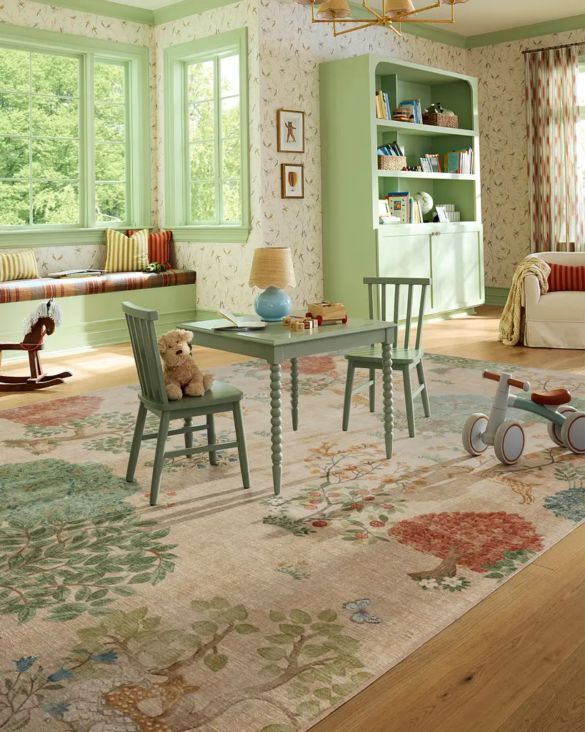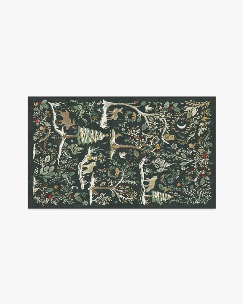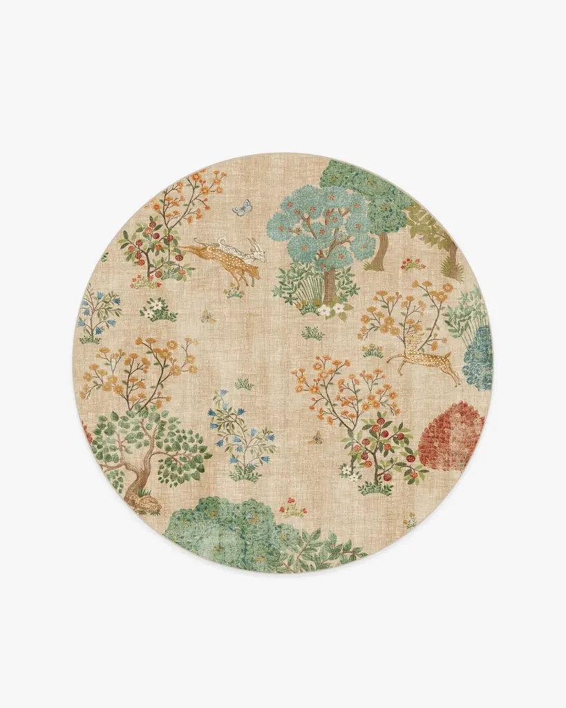 Transform your home with the charming patterns and wild woodland treasures of our Sanderson Pamir Garden Fern Rug. Referencing two Sanderson designs, Pamir Garden and Foraging, this design features a scene of floral sprigs, stylized trees, and antelopes, all interwoven with wild berries, sloes, and delicate blossom trails. The palette of reds, oranges, yellows, greens, blues, and browns is accented with pops of light cream against a light natural background. Water-resistant, stain-resistant, and machine-washable. Rug colors may vary slightly according to your device and the lighting in your space.
