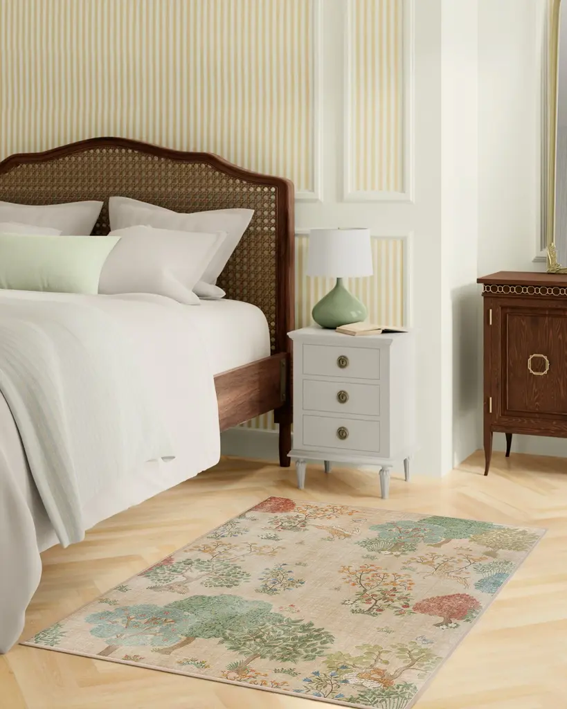 Transform your home with the charming patterns and wild woodland treasures of our Sanderson Pamir Garden Fern Rug. Referencing two Sanderson designs, Pamir Garden and Foraging, this design features a scene of floral sprigs, stylized trees, and antelopes, all interwoven with wild berries, sloes, and delicate blossom trails. The palette of reds, oranges, yellows, greens, blues, and browns is accented with pops of light cream against a light natural background. Water-resistant, stain-resistant, and machine-washable. Rug colors may vary slightly according to your device and the lighting in your space.
