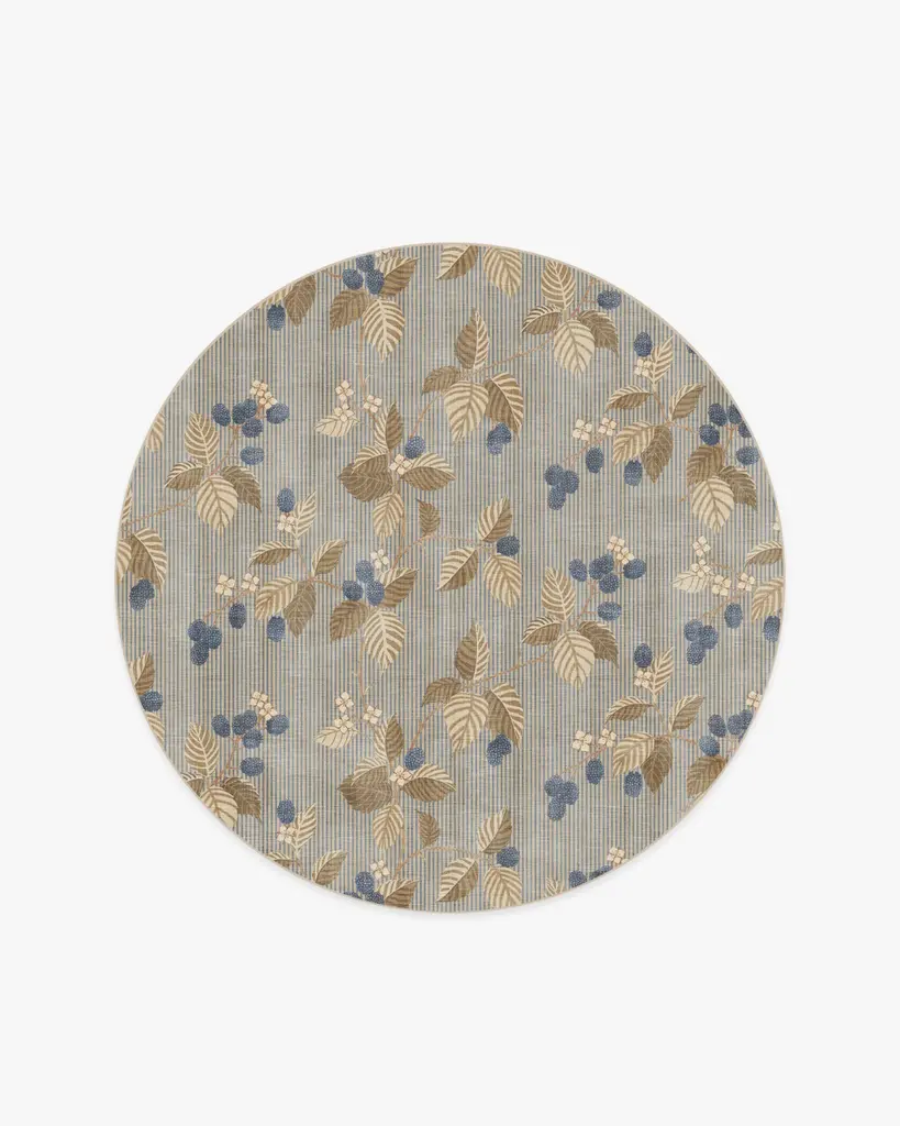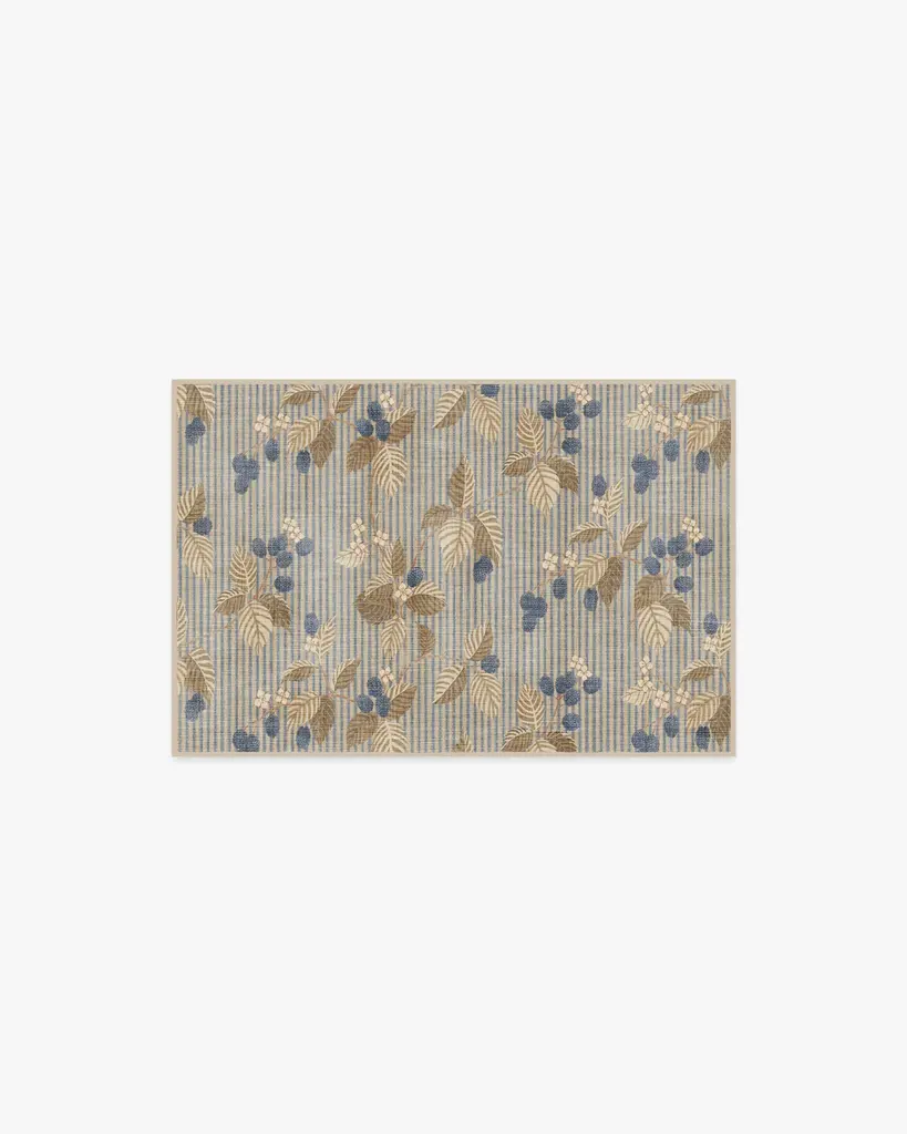 Bring home woodland wonder with our Sanderson Rubus Azure & Fawn Rug. Showcasing the blackberry Rubus, a genus of flowering plants in the rose family, raspberries and blackberries sit against a simple striped background. A palette of navy and blue shades—complemented by browns, creams, and pinks—contrasts beautifully with the neutral beige background. Water-resistant, stain-resistant, and machine-washable. Rug colors may vary slightly according to your device and the lighting in your space.