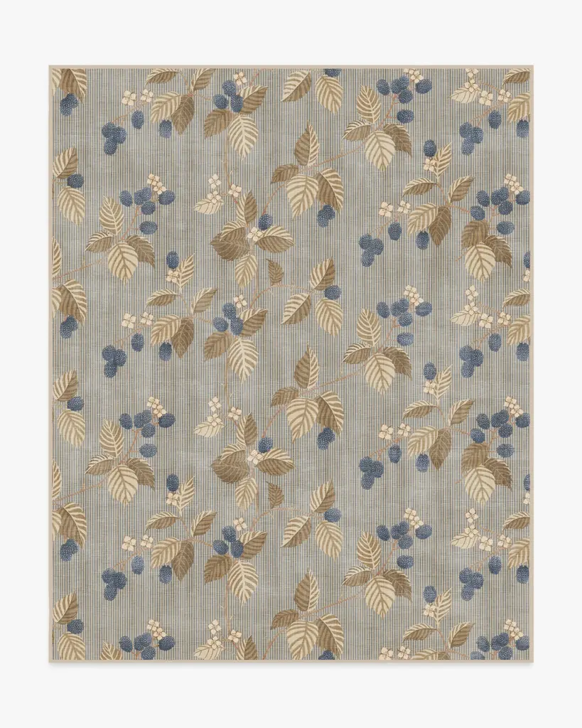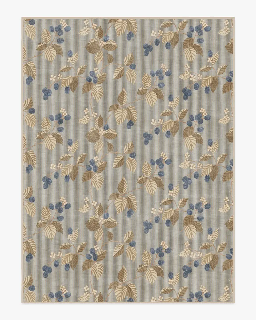 Bring home woodland wonder with our Sanderson Rubus Azure & Fawn Rug. Showcasing the blackberry Rubus, a genus of flowering plants in the rose family, raspberries and blackberries sit against a simple striped background. A palette of navy and blue shades—complemented by browns, creams, and pinks—contrasts beautifully with the neutral beige background. Water-resistant, stain-resistant, and machine-washable. Rug colors may vary slightly according to your device and the lighting in your space.