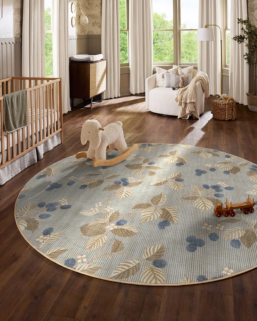 Bring home woodland wonder with our Sanderson Rubus Azure & Fawn Rug. Showcasing the blackberry Rubus, a genus of flowering plants in the rose family, raspberries and blackberries sit against a simple striped background. A palette of navy and blue shades—complemented by browns, creams, and pinks—contrasts beautifully with the neutral beige background. Water-resistant, stain-resistant, and machine-washable. Rug colors may vary slightly according to your device and the lighting in your space.