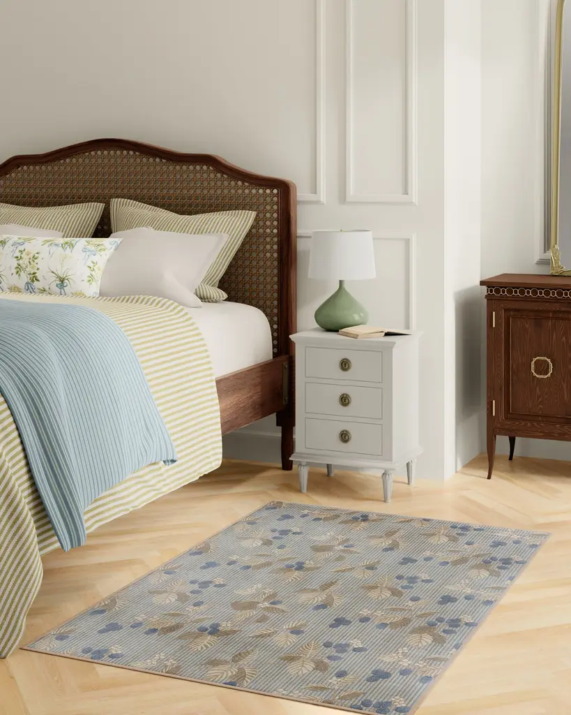 Bring home woodland wonder with our Sanderson Rubus Azure & Fawn Rug. Showcasing the blackberry Rubus, a genus of flowering plants in the rose family, raspberries and blackberries sit against a simple striped background. A palette of navy and blue shades—complemented by browns, creams, and pinks—contrasts beautifully with the neutral beige background. Water-resistant, stain-resistant, and machine-washable. Rug colors may vary slightly according to your device and the lighting in your space.