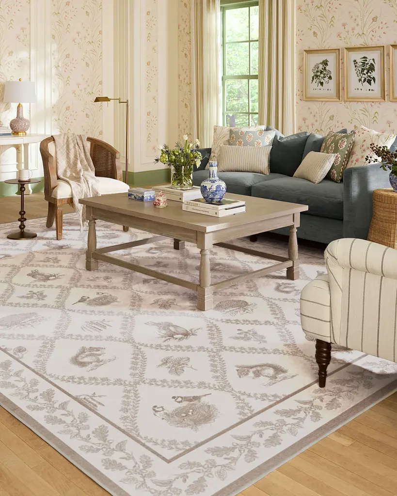 Feel the charm of the woodland with our Sanderson Squirrel & Hedgehog Fawn Rug. Referencing the Squirrel & Hedgehog design by Sanderson, this rug features delicate linework drawings of beloved British wildlife: a squirrel, rabbit, and hedgehog, accompanied by natural British flora, including acorns, catkins, and blackberries. These motifs are beautifully arranged within a lattice structure, framed by a floral border that complements the flora in the design. A soft palette of taupes is set against a warm vanilla background. Water-resistant, stain-resistant, and machine-washable. Rug colors may vary slightly according to your device and the lighting in your space.