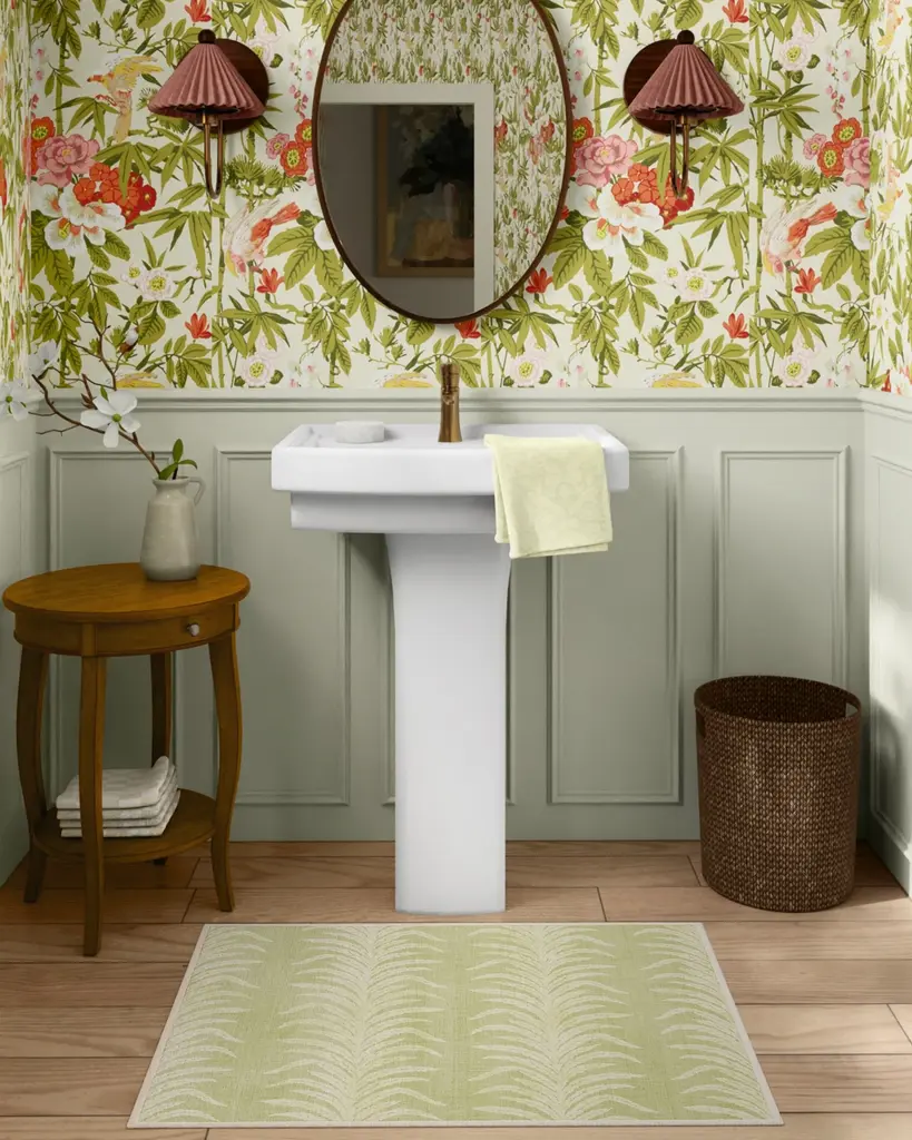 Your story begins at home with our Sanderson Tree Fern Matcha Green Rug. This design features textured tree fern silhouettes that create organic movement within the motifs. The balance of bright cream and soft gold against the matcha green background adds serenity to any space. Water-resistant, stain-resistant, and machine-washable. Rug colors may vary slightly according to your device and the lighting in your space.