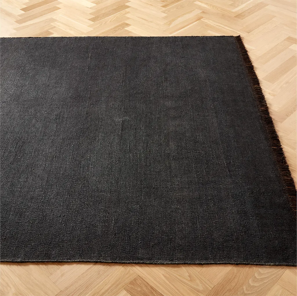 Flatweave charcoal rug is woven from a combination of natural linen and jute. Washed to soften the fibers and add a subtle sheen, rug is finished with handwoven fringe. Perfect for medium-traffic areas. CB2 exclusive. How will it look in your room? 12"x12" rug samples are available in stores for a fee refundable upon return of the sample.