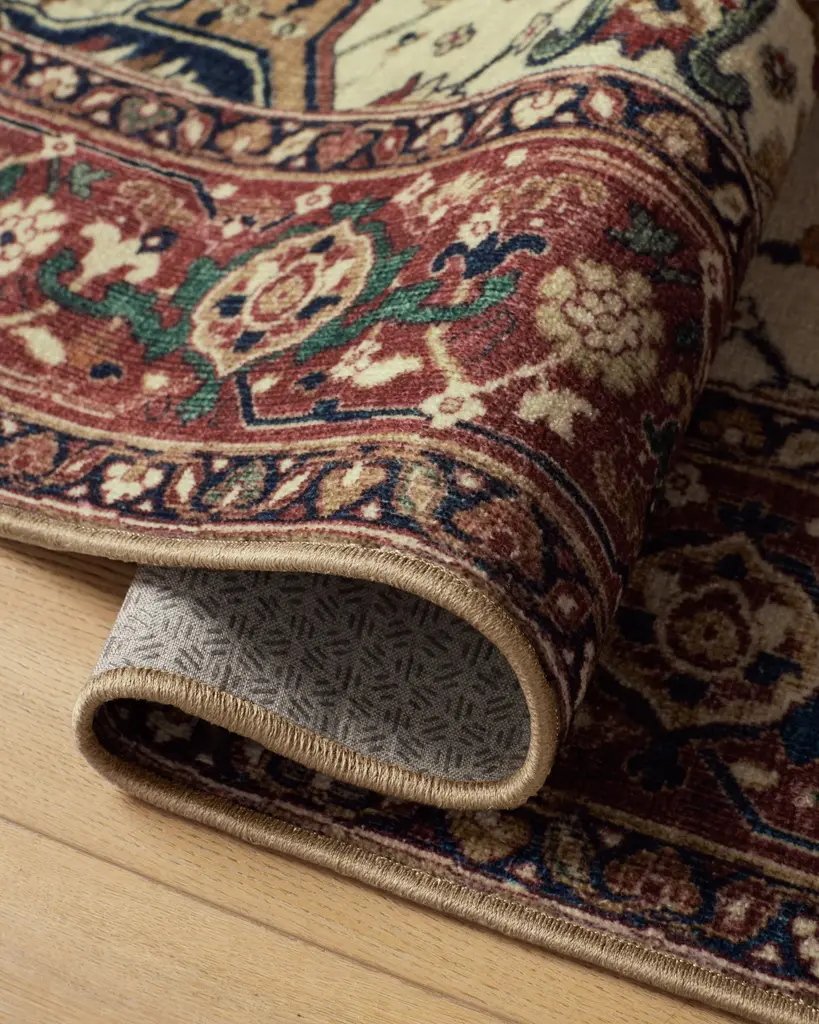 It’s time to warm things up a bit. The Santiago Carmel & Scarlet Rug features a bold center medallion with a scarlet red base, warm gold hues, and hints of sky blue, indigo, and orange. This antique Persian-inspired rug draws the eye with an organic, subtly imperfect flow that will make it look like it’s been in your family for generations. Water-resistant, stain-resistant, and machine-washable. Colors may vary by device and lighting