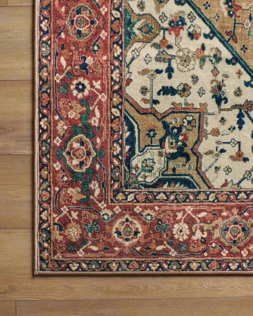It’s time to warm things up a bit. The Santiago Carmel & Scarlet Rug features a bold center medallion with a scarlet red base, warm gold hues, and hints of sky blue, indigo, and orange. This antique Persian-inspired rug draws the eye with an organic, subtly imperfect flow that will make it look like it’s been in your family for generations. Water-resistant, stain-resistant, and machine-washable. Colors may vary by device and lighting