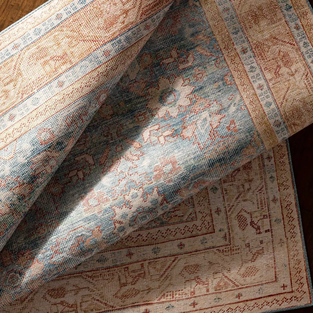 Collection: Santol Colors: Cream, Denim, Sage, Rust, Navy, Olive Construction: Machine Woven Material: 100% Polyester Pile: No Pile Styles: Traditional Backing: Canvas Made In: China Thickness: 0.28" Price Range: $$$$$ (Affordable)